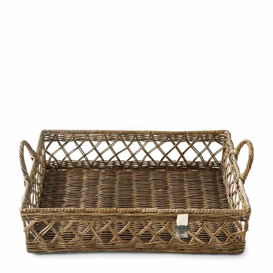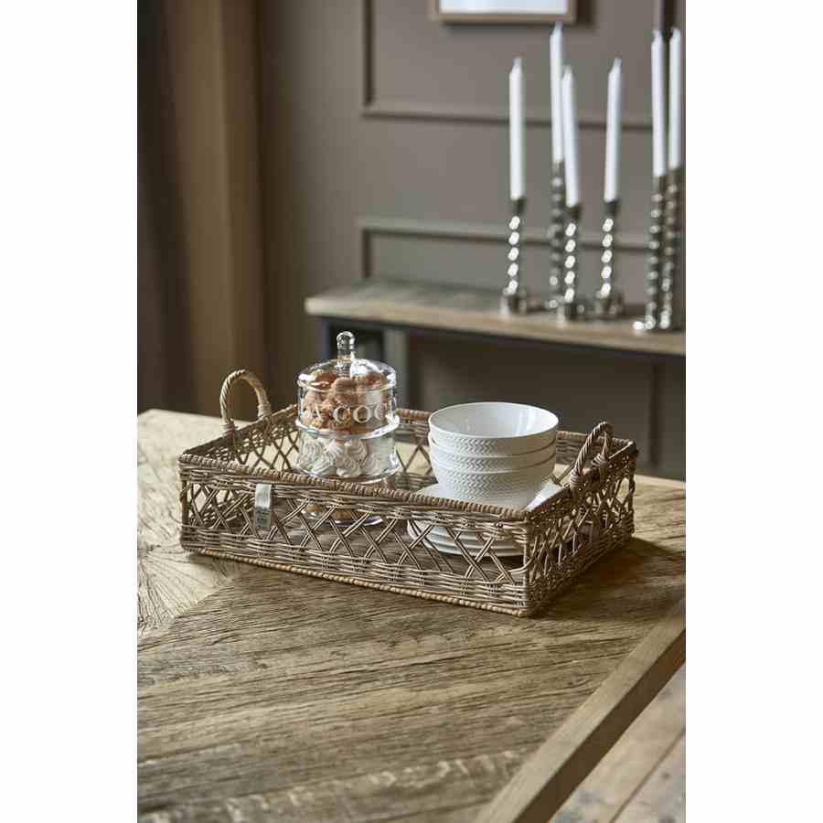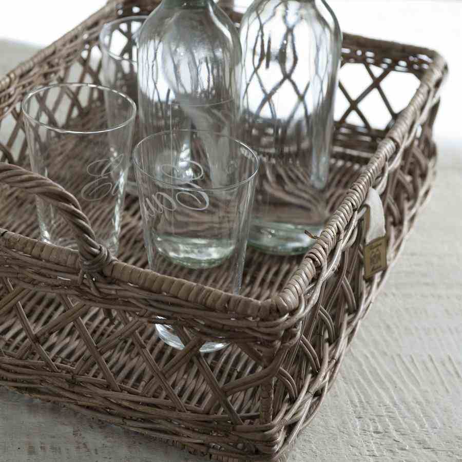 Dette multifunksjonelle serveringsbrettet laget av spesialbehandlet grå rotting ser nydelig ut på kjøkkenet med glass på eller på salongbordet med dekorasjoner. Tilgjengelig i 45×30 cm og 60×40 cm.