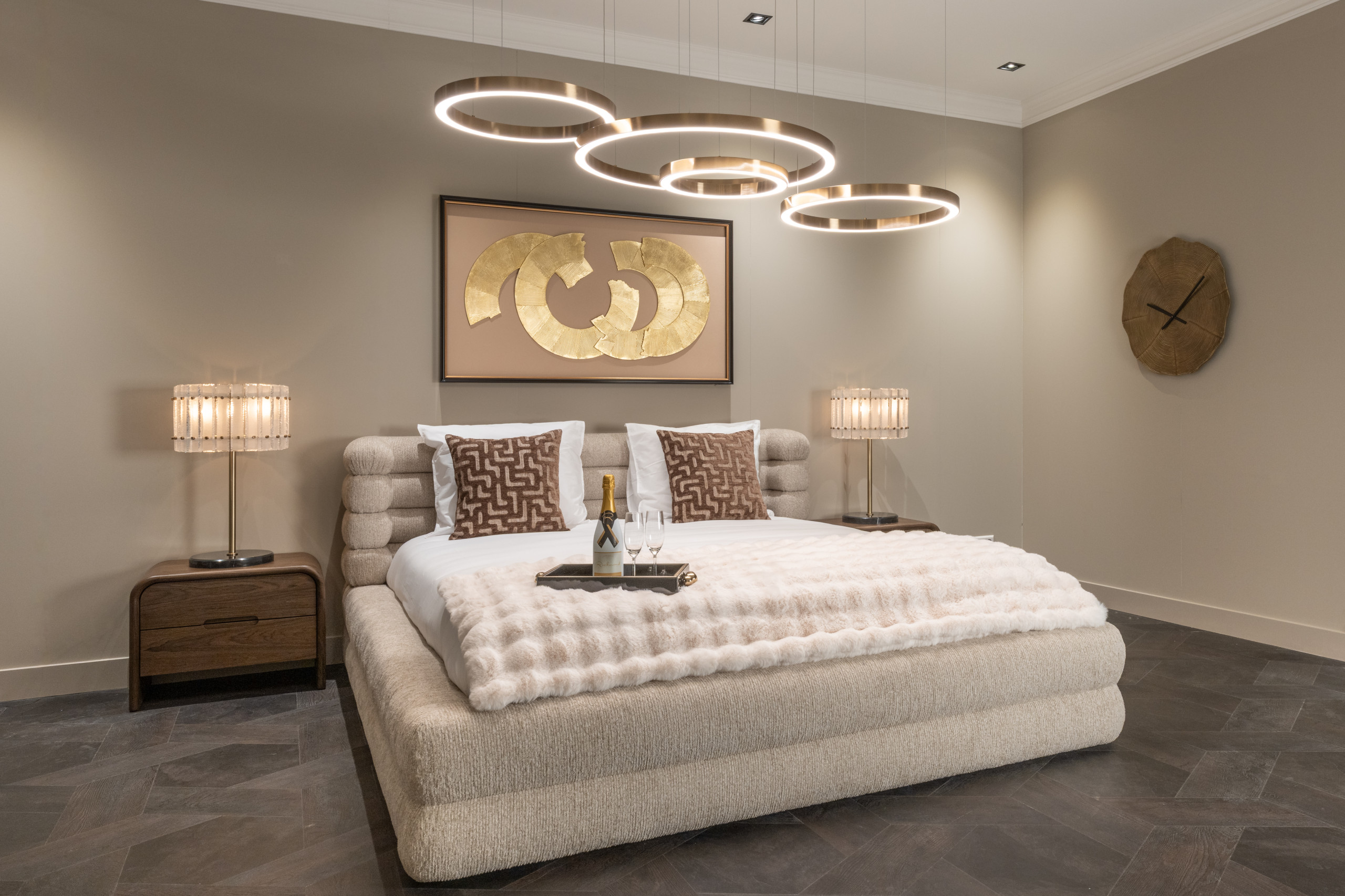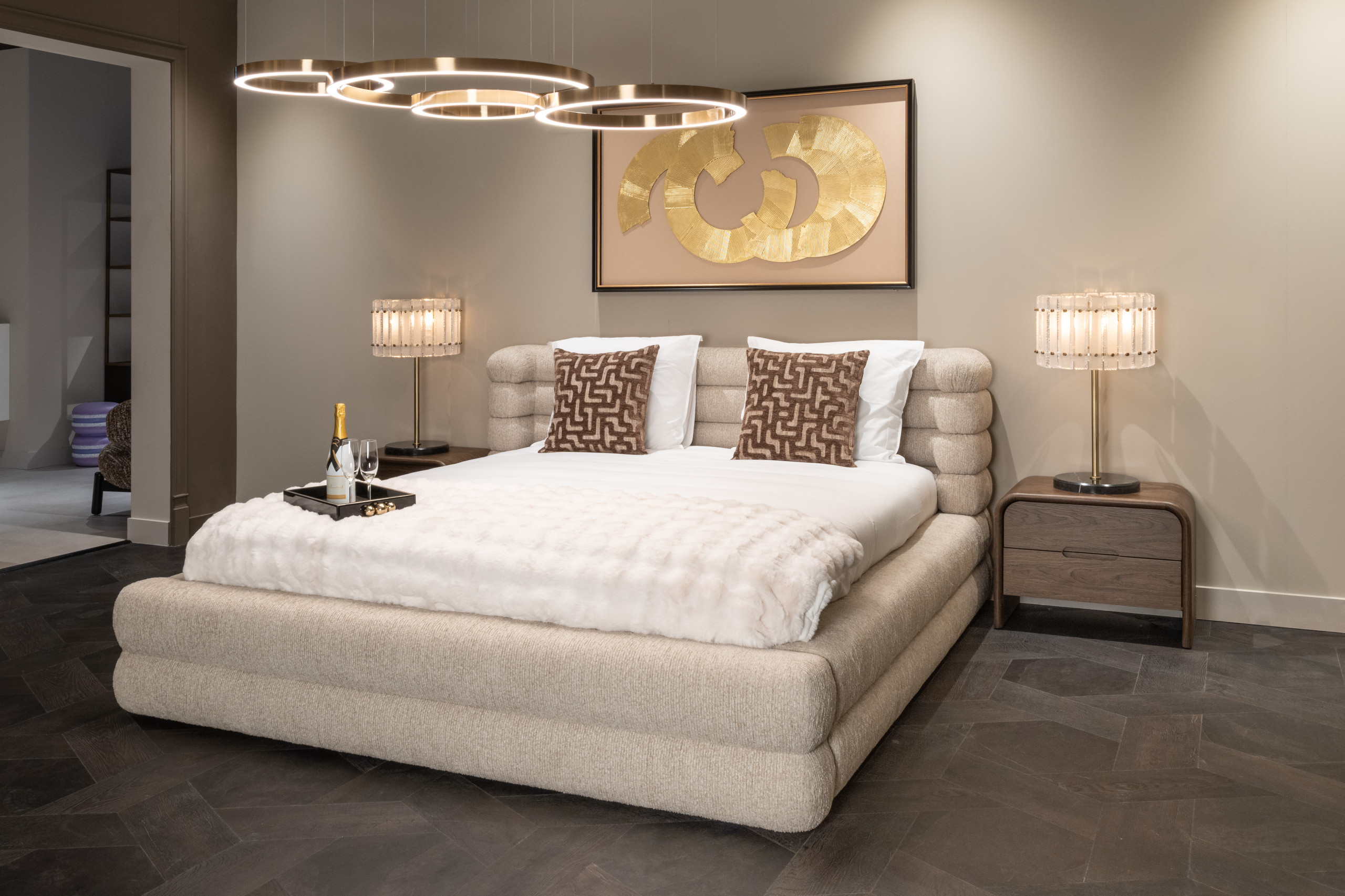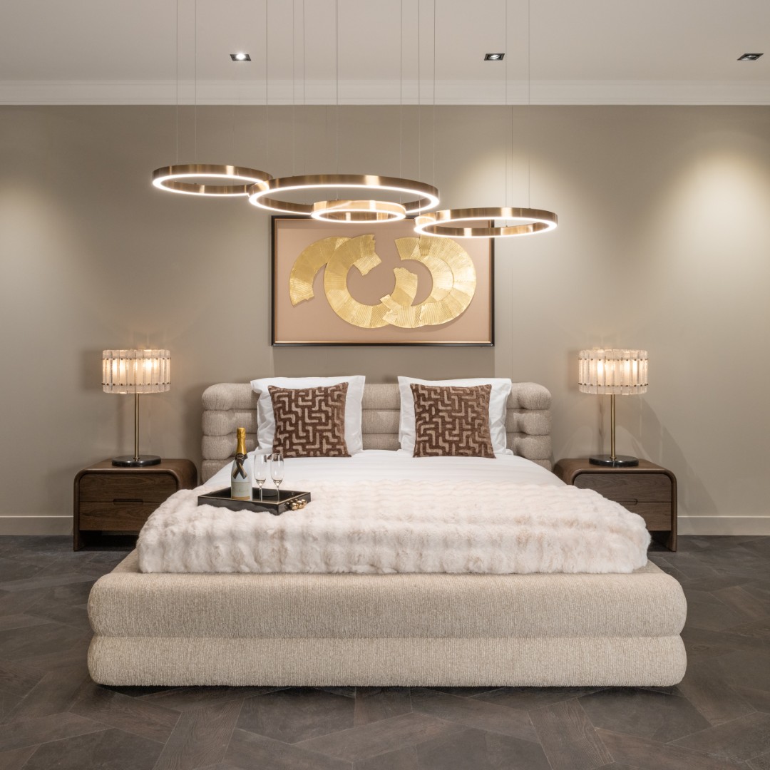 This bed features a spacious, straight-lined design with a fully upholstered appearance. The fabric shows a natural, light texture that creates a calm atmosphere. Integrated storage is discreetly incorporated.
