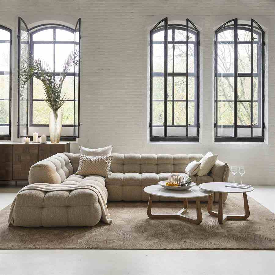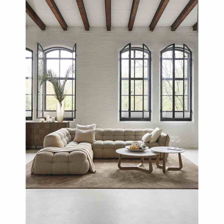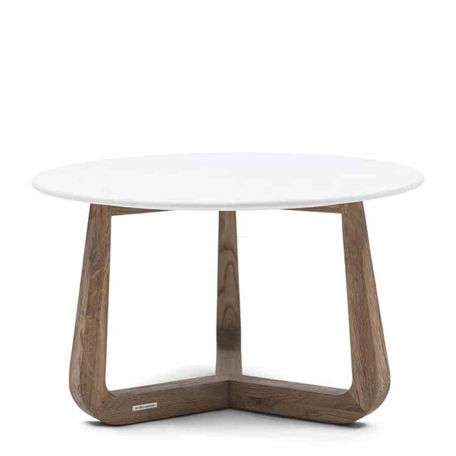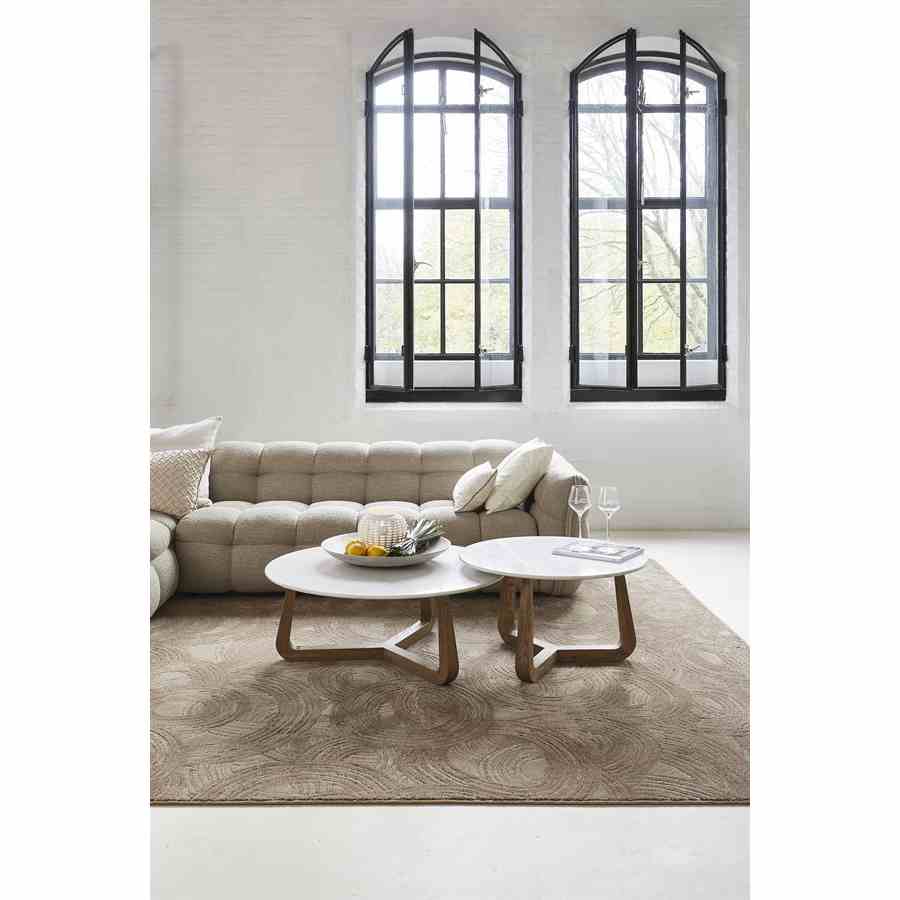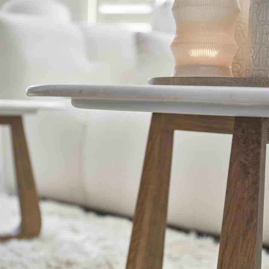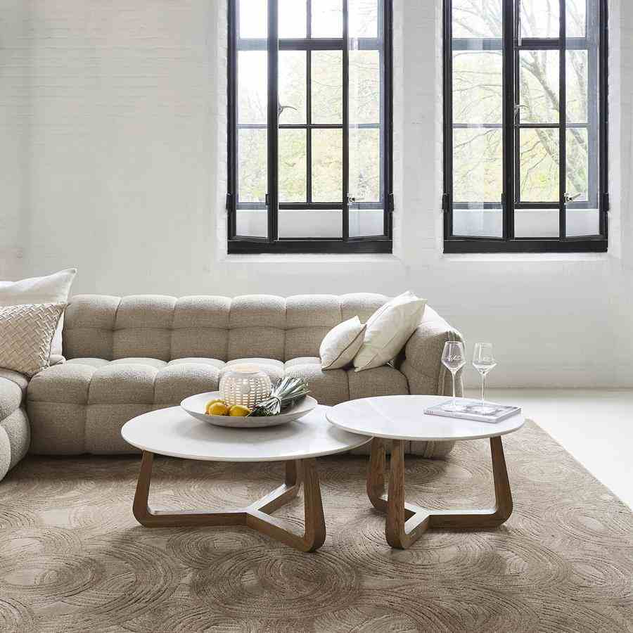 Dette salongbordet skiller seg ut for sitt unike design. Den runde marmortoppen gir et luksuriøst utseende, mens de tre eikebena kommer i et moderne design. Den subtile Riviera Maison-logoen på benet gir en sofistikert detalj. Takket være natursteinen er hvert bord unikt, så du vil alltid ha et unikt stykke i interiøret ditt. Perfekt for et stilig og moderne preg i stuen din.