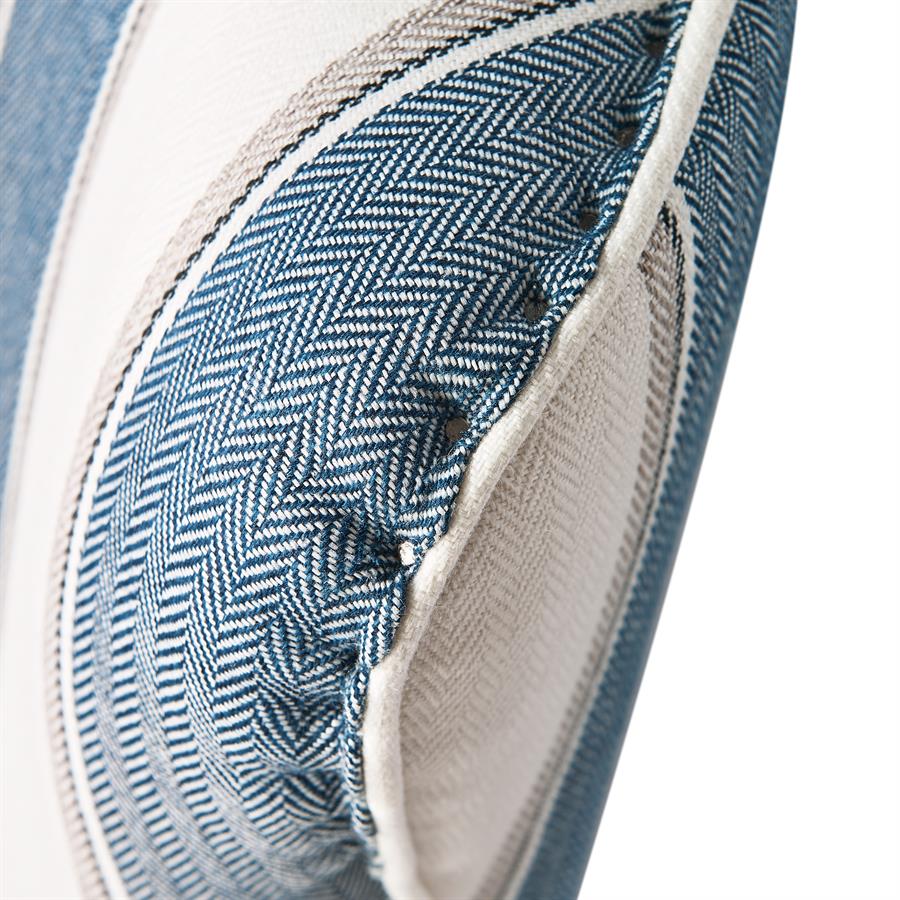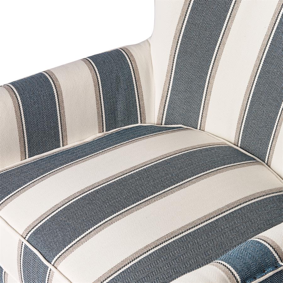 Denne komfortable lenestolen er et ekte blikkfang i interiøret ditt. Ved å veksle mellom de blå stripene med de hvite får stolen en frisk og ung karakter. De dansende bena av gummitre gir stolen et lekent utseende. Neglene som ble brukt til å fullføre stolen rundt forsterker også dette ungdommelige utseendet.