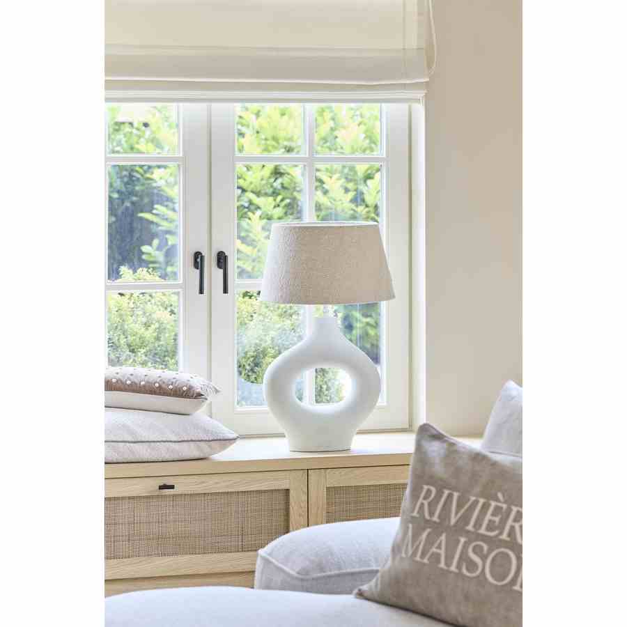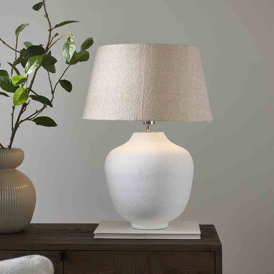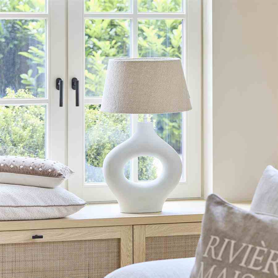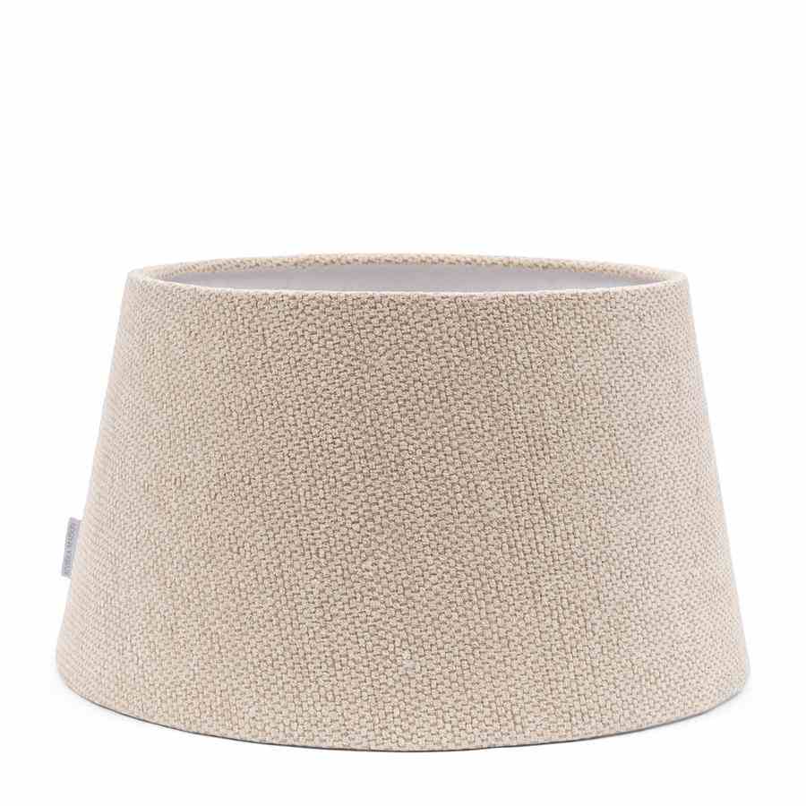 Denne lampeskjermen i myk beige er laget av vevd stoff og gir et elegant og sofistikert utseende. Stoffets nøytrale farge og rike tekstur blander seg uanstrengt med en rekke interiørstiler, og skaper en varm, innbydende atmosfære i alle rom.