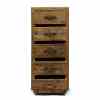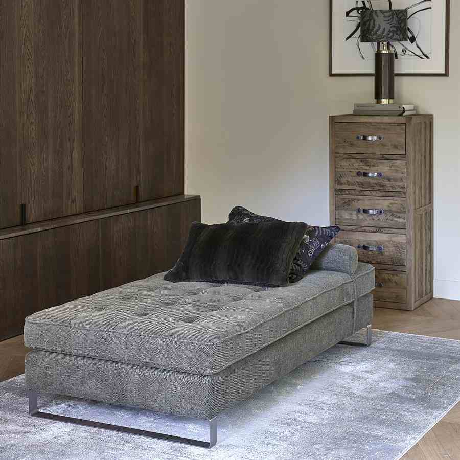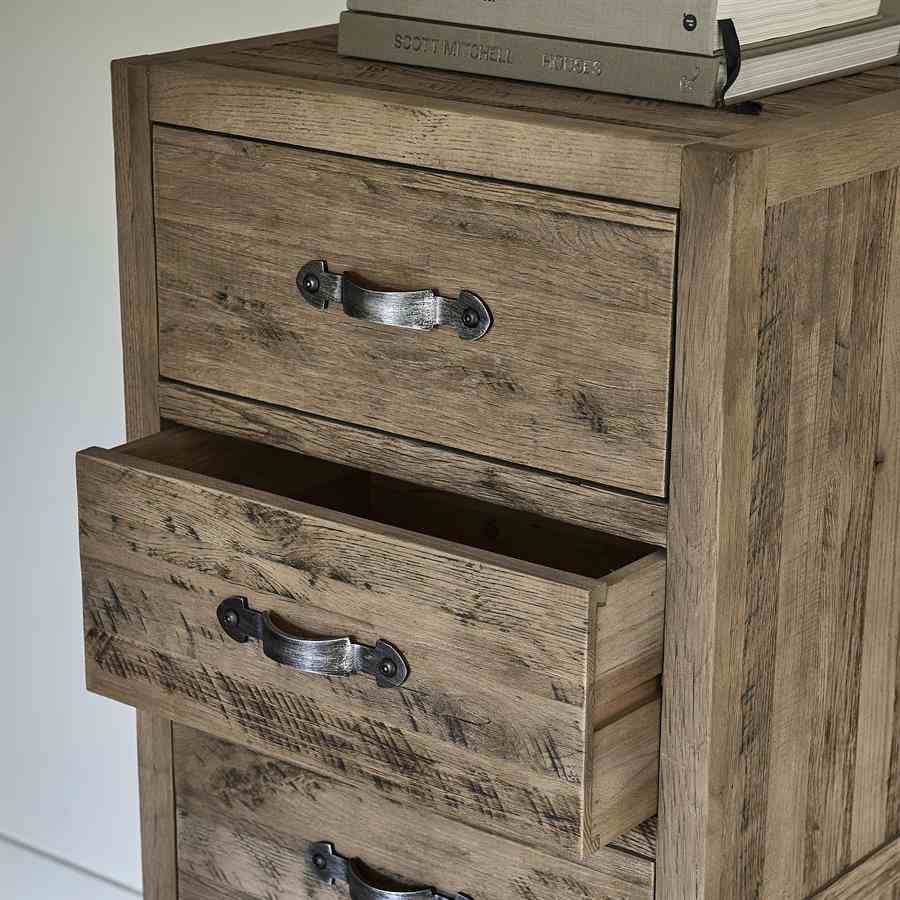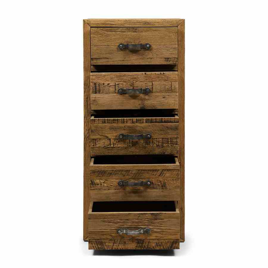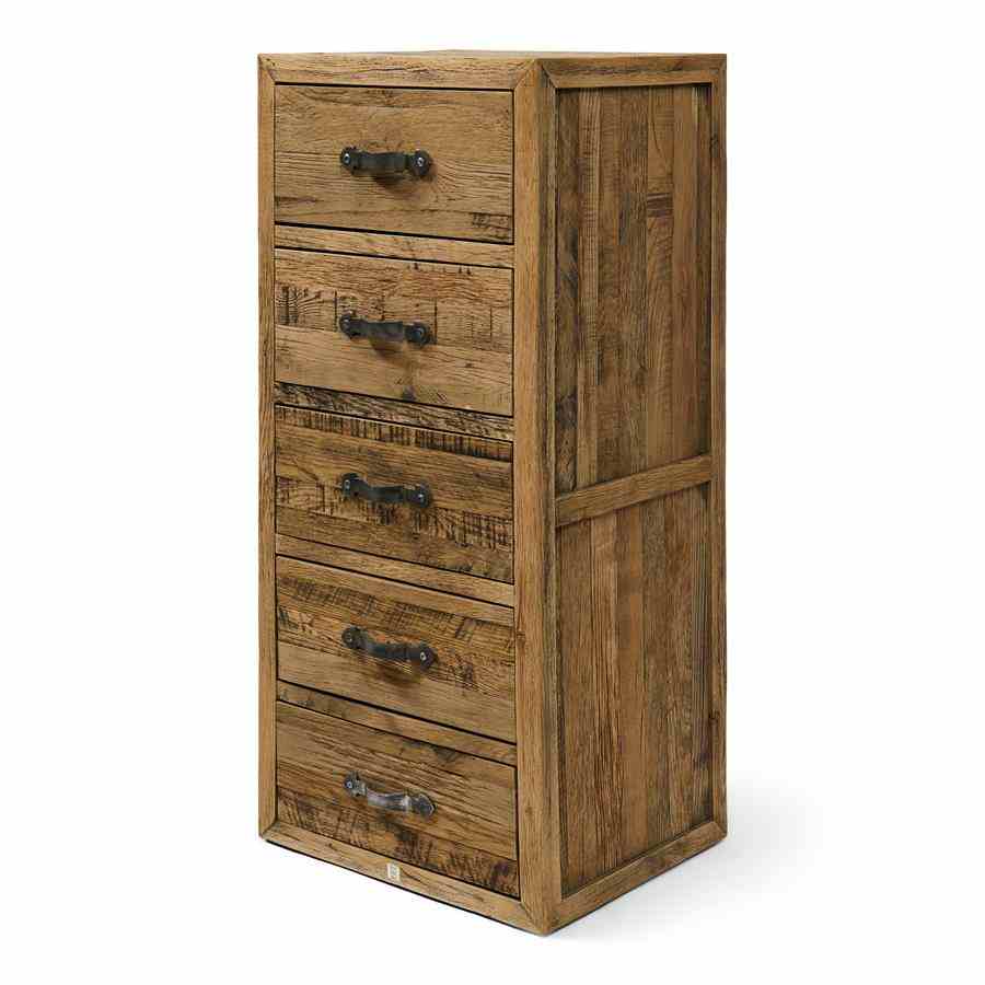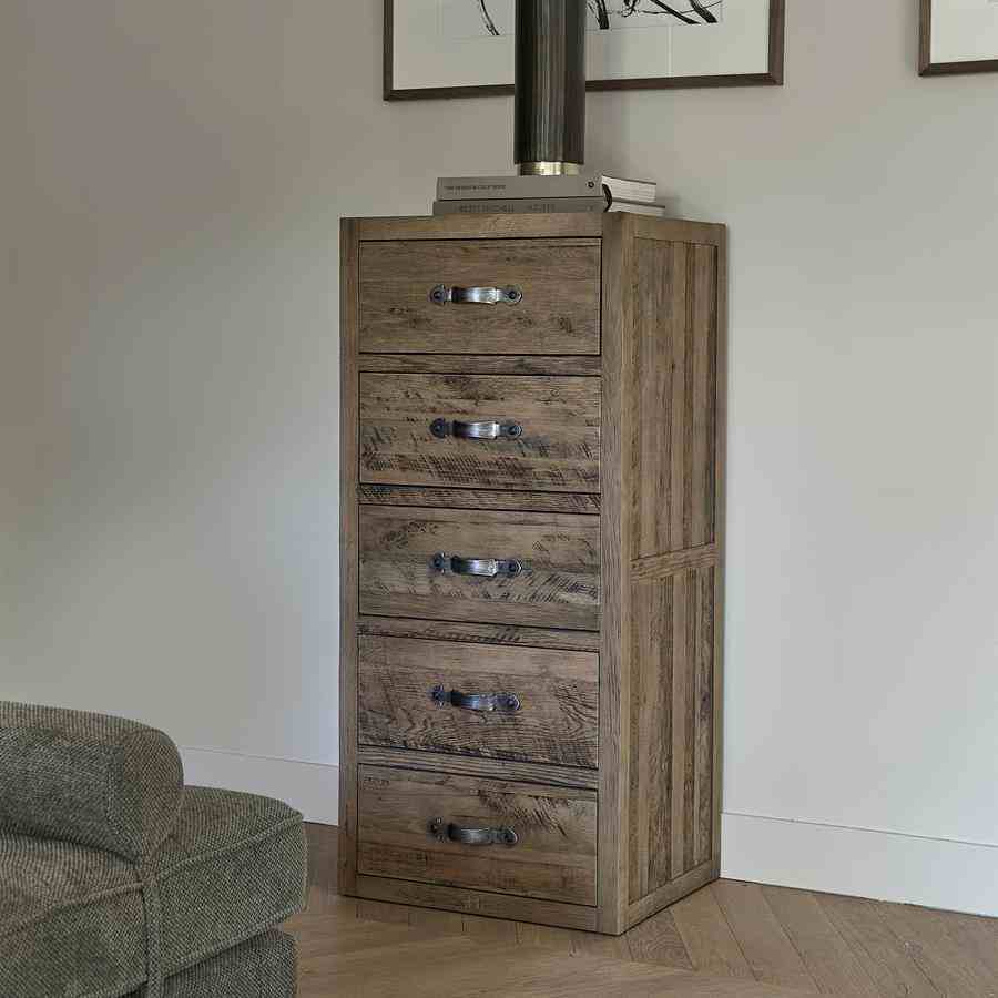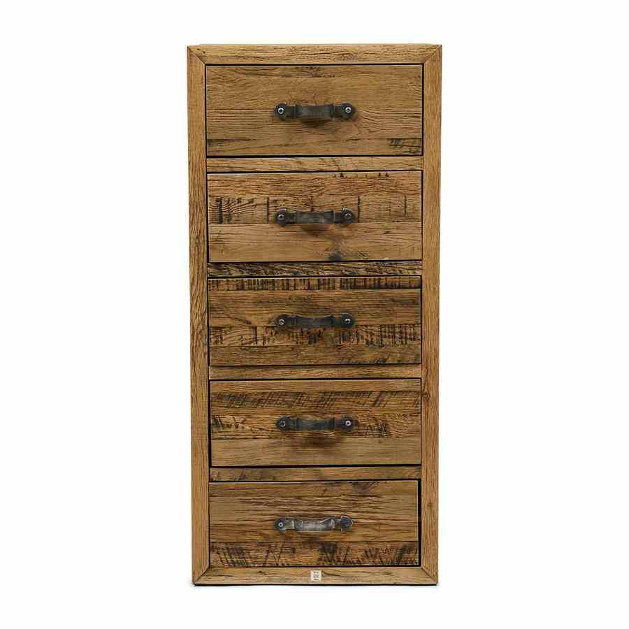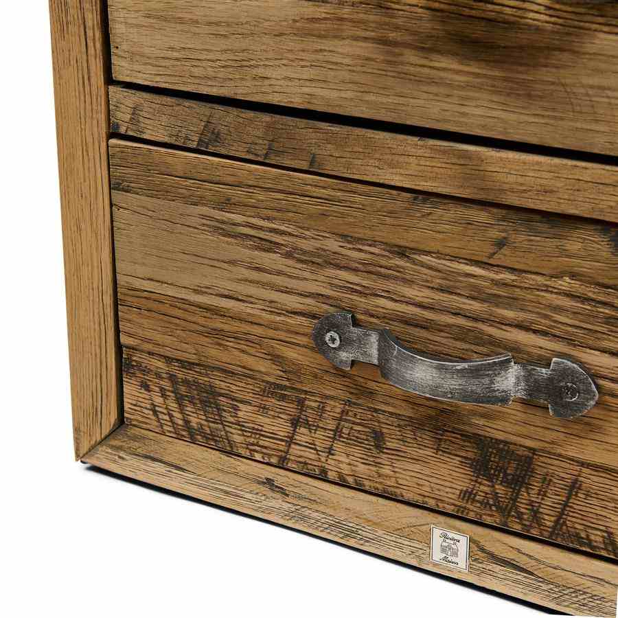 Leter du etter møbler med et slitt utseende? Connaught kommode høy er akkurat tingen for deg. Denne kista er laget av robust gammel eik. Treet er nydelig bearbeidet for et robust, naturlig utseende. Skuffene har klassiske buede håndtak av rustfritt stål med børstet finish som prikken over i-en.