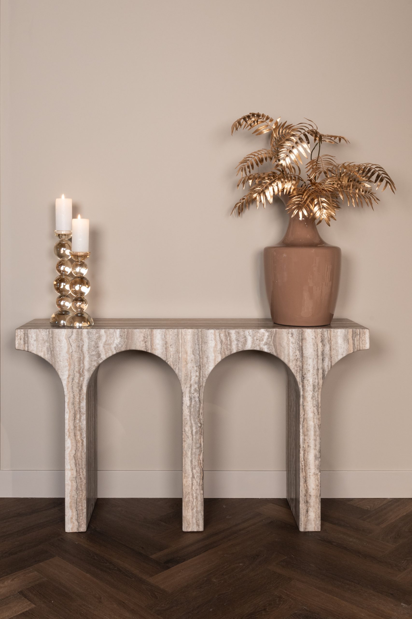 Console Dulce stands out with its triple column base and faux travertine finish. A striking yet neutral console for hallways or living rooms.