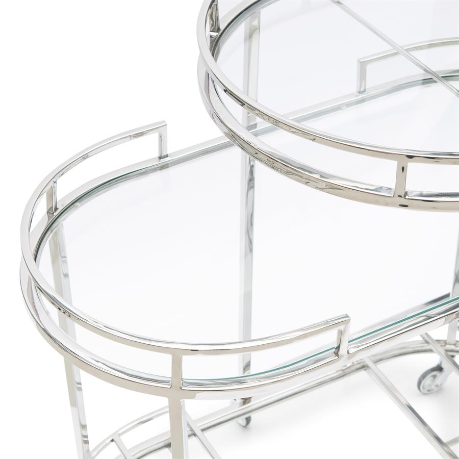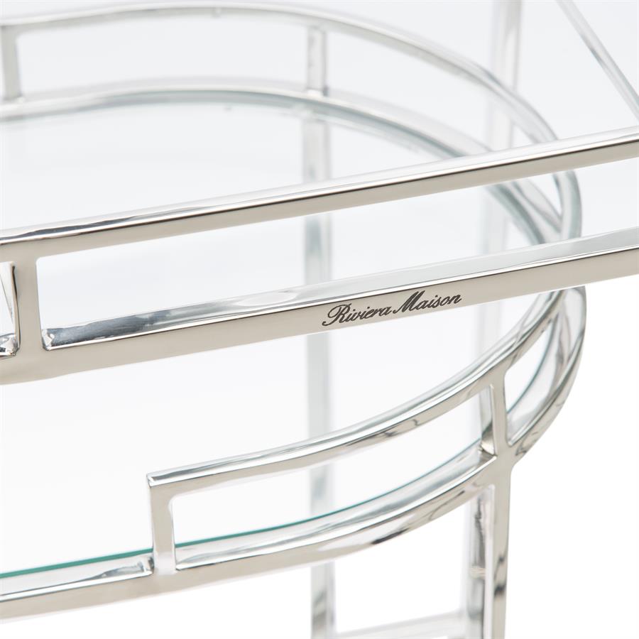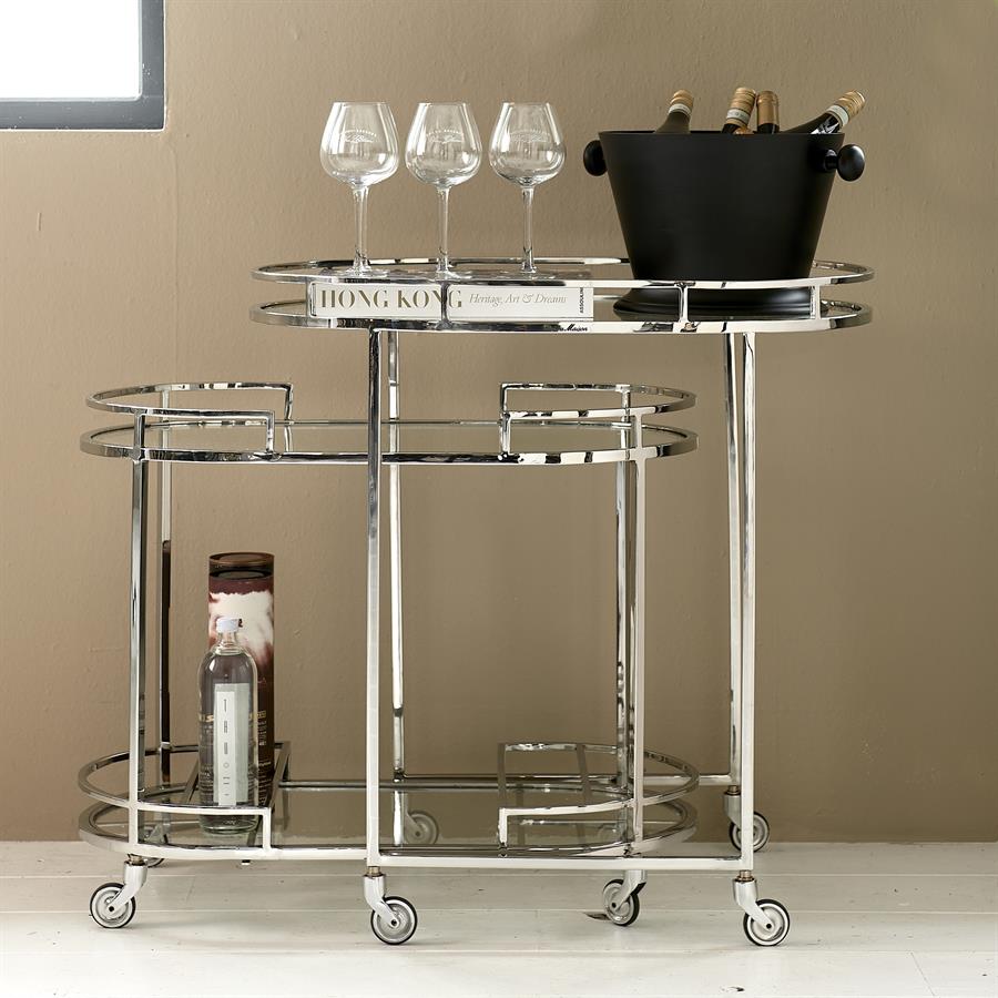 Crosby Street Bar Cart er et luksuriøst sett med to sidebord som kan brukes sammen eller hver for seg. Takket være hjulene kan du enkelt skyve bordene over hverandre eller bære brett over til sofaen. Den er ideell for dine vakreste glass og kanner. De ovale bordplatene er laget av glass, og rammene i rustfritt stål.