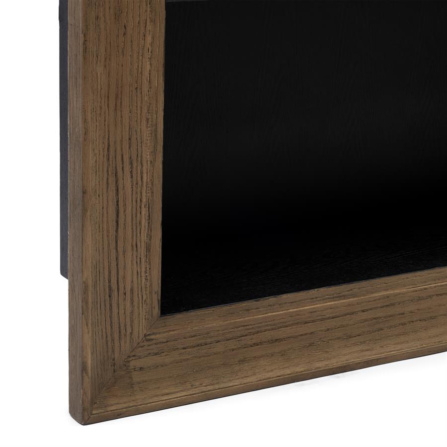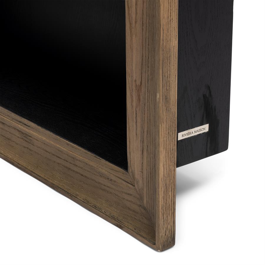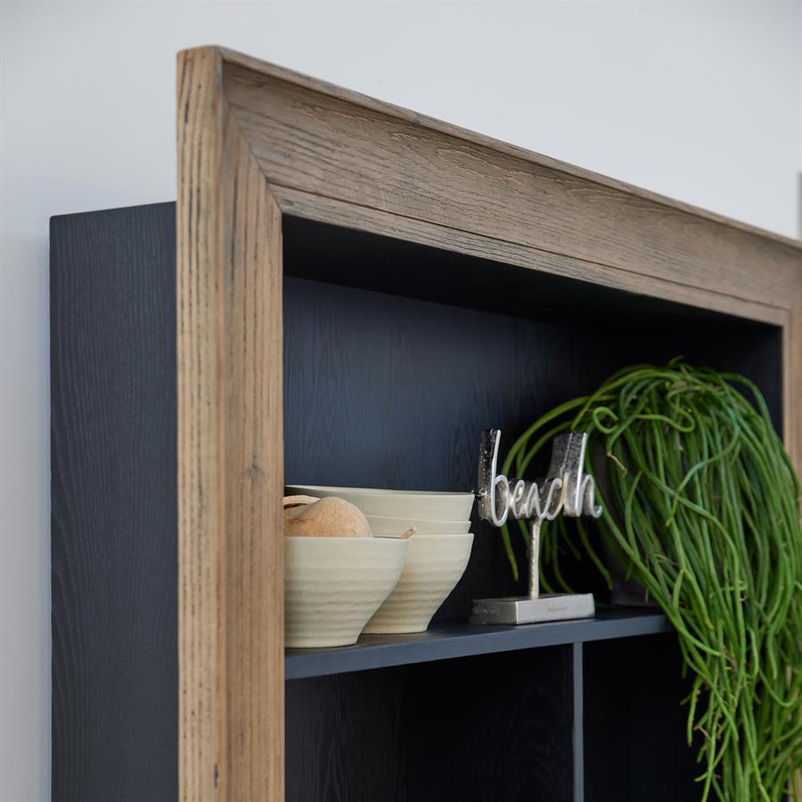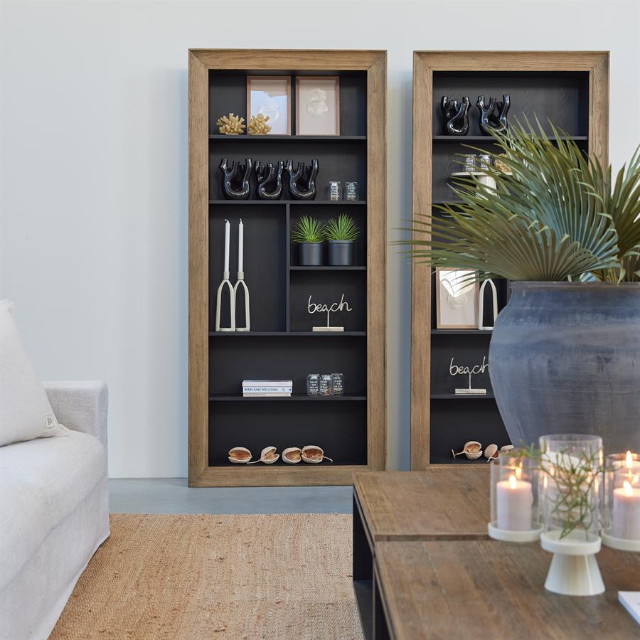 Dette er Evissa bokhylle, et virkelig spesielt møbel i Riviera Maisons samling. Dette er fordi skapet er veldig grunt, så det tar liten plass, men fungerer perfekt som en bokhylle. I tillegg har bokhyllen en bred ramme, som gjør at den ser litt ut som et maleri. Du fester den til veggen, men lar den hvile på gulvet.