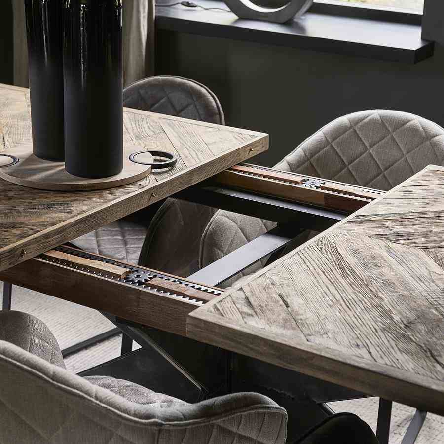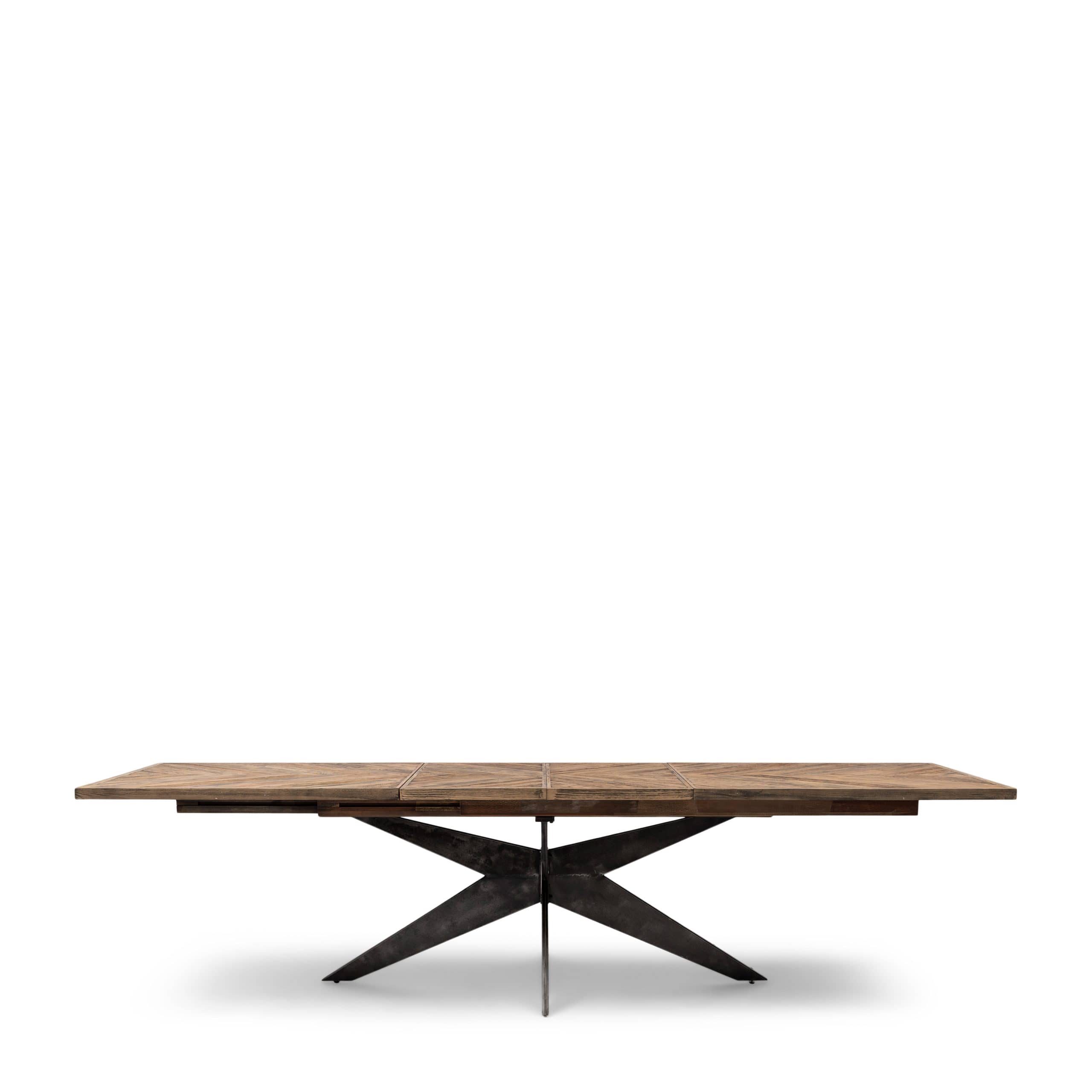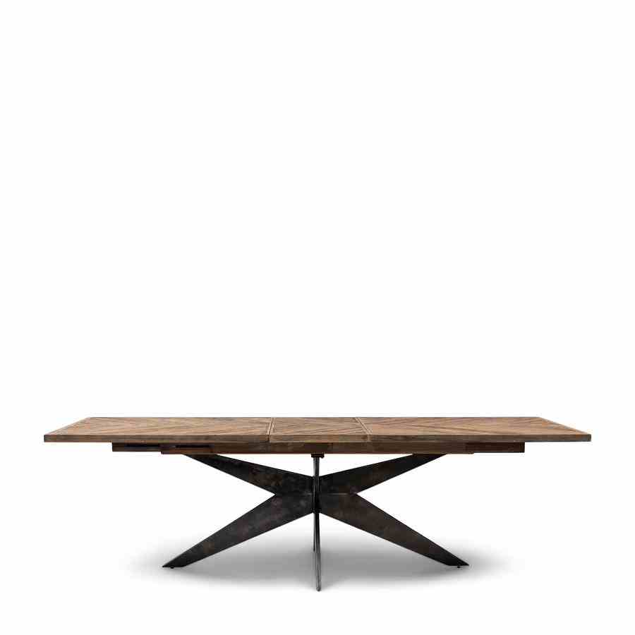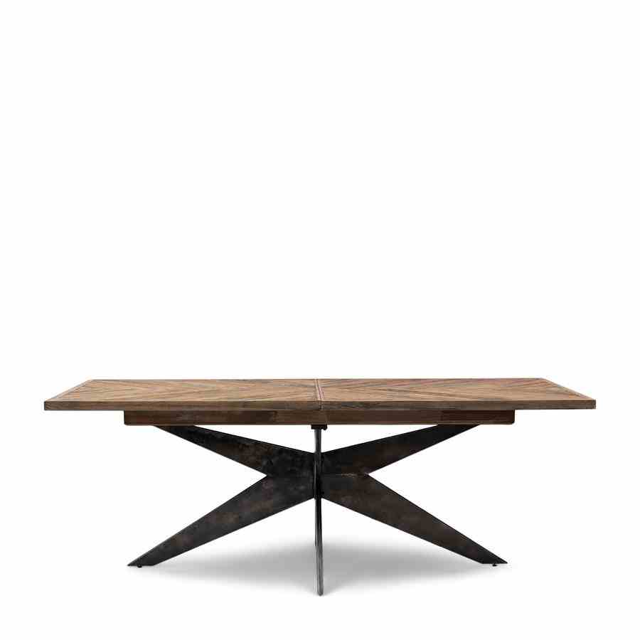 Dette bordet, laget av gjenvunnet eik, har en behagelig lengde på 220 cm. Hvis du har flere gjester, kan den enkelt utvides til 270 cm eller til og med til 320 cm lang. Bordet har en vakkert bearbeidet treplate og en solid svart ramme og ben.