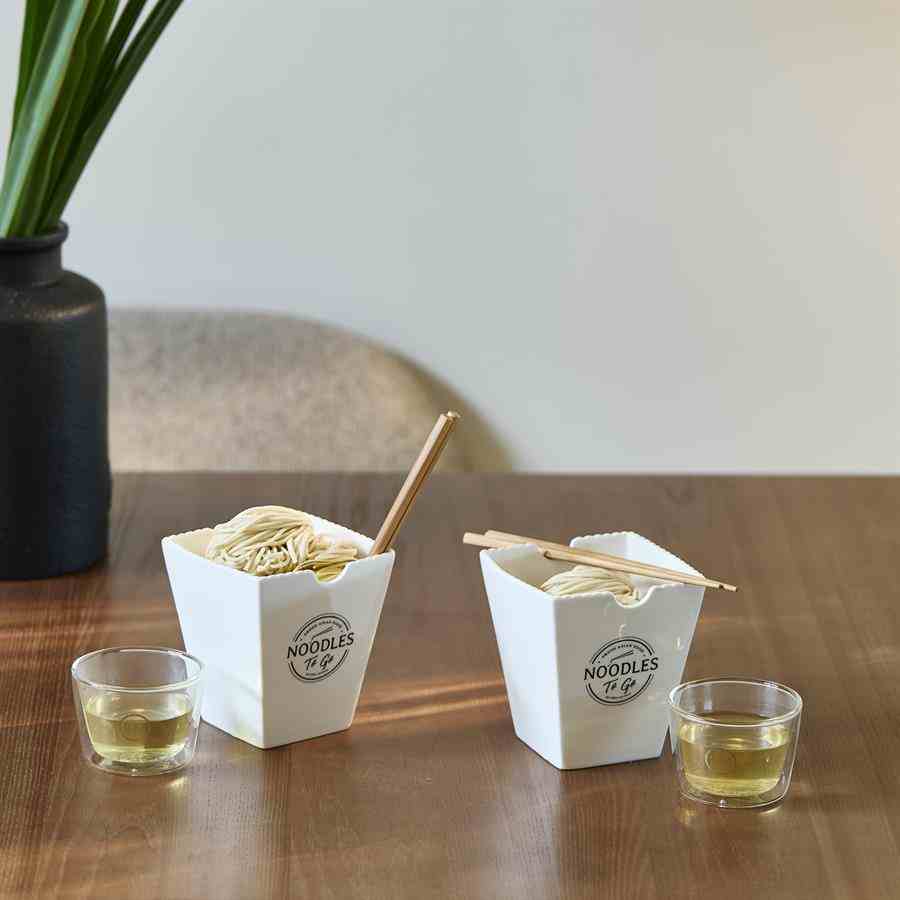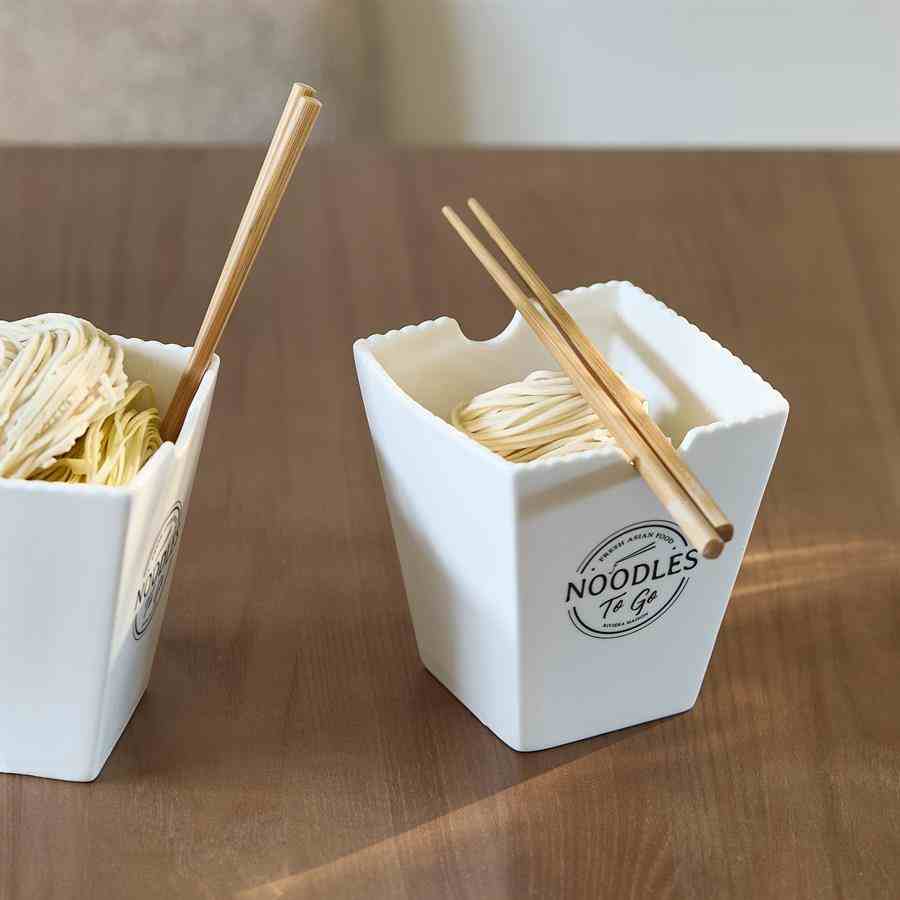 Deilig asiatisk matlaging og server deretter måltidet i disse «to go»-koppene. Laget av vakkert hvitt porselen med inskripsjon. Eller bruk noen av disse koppene som boller til ulike retter. For nudler for eksempel, eller til ris eller krydrede grønnsaker. Det er mange muligheter for de som tenker ut av boksen.