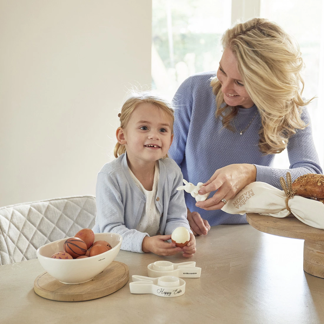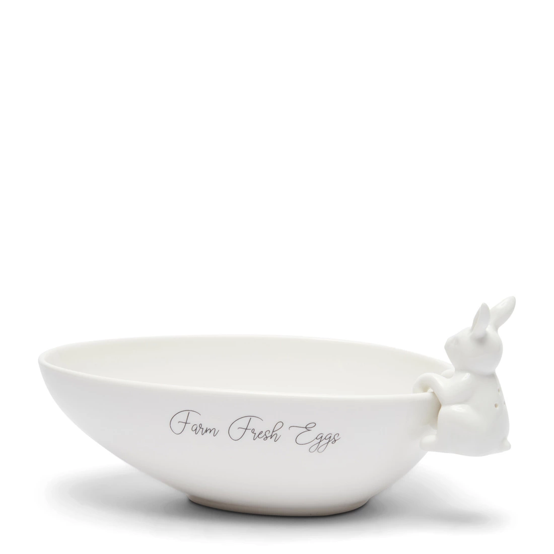 Egg i eggeskallet, Fresh Farm Eggs Bowl. God riddance, og den morsomme påskeharen som haiker langs bak tar seg av saltet. Bare se på ryggen hans. Hvit keramikk, fin og praktisk og passer til alle slags kjøkken.