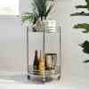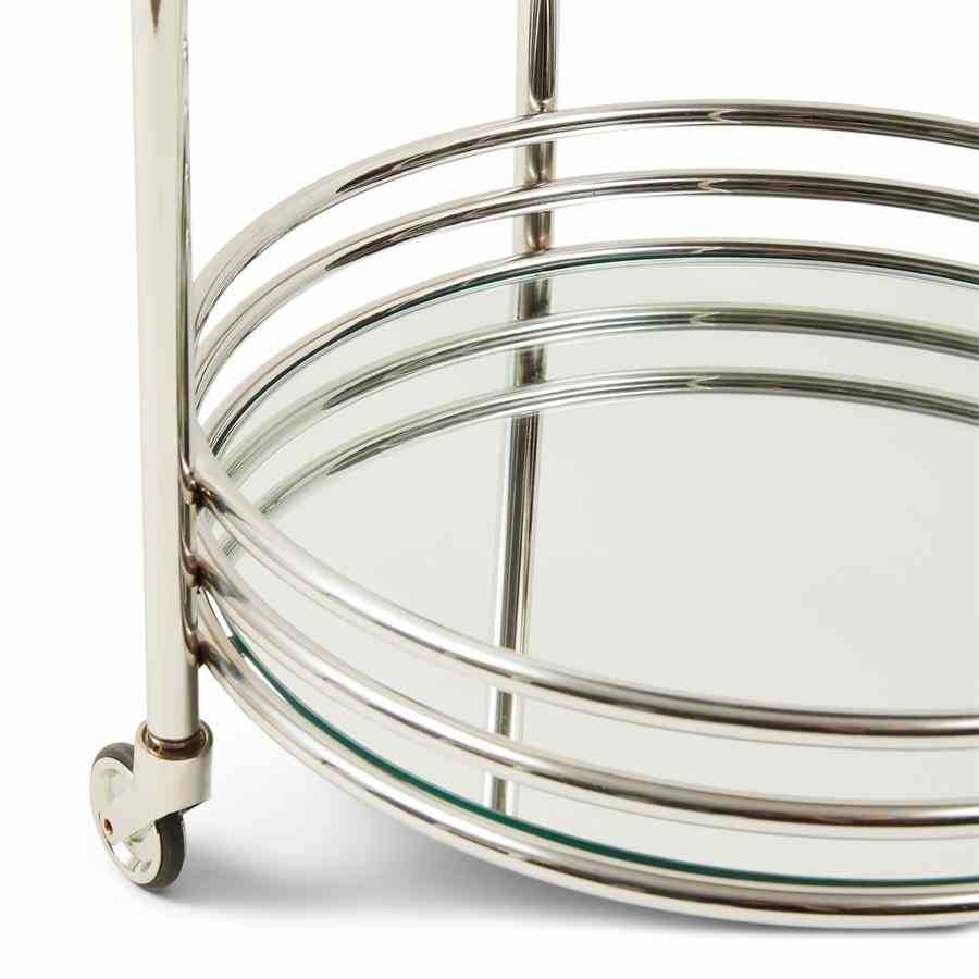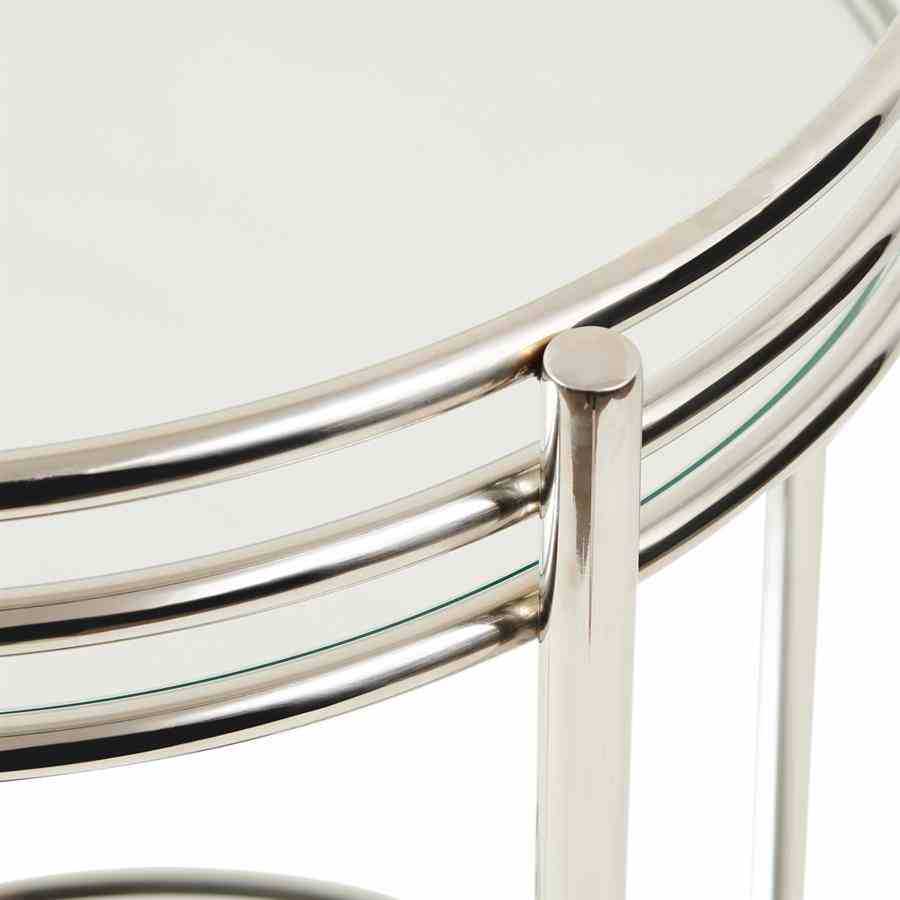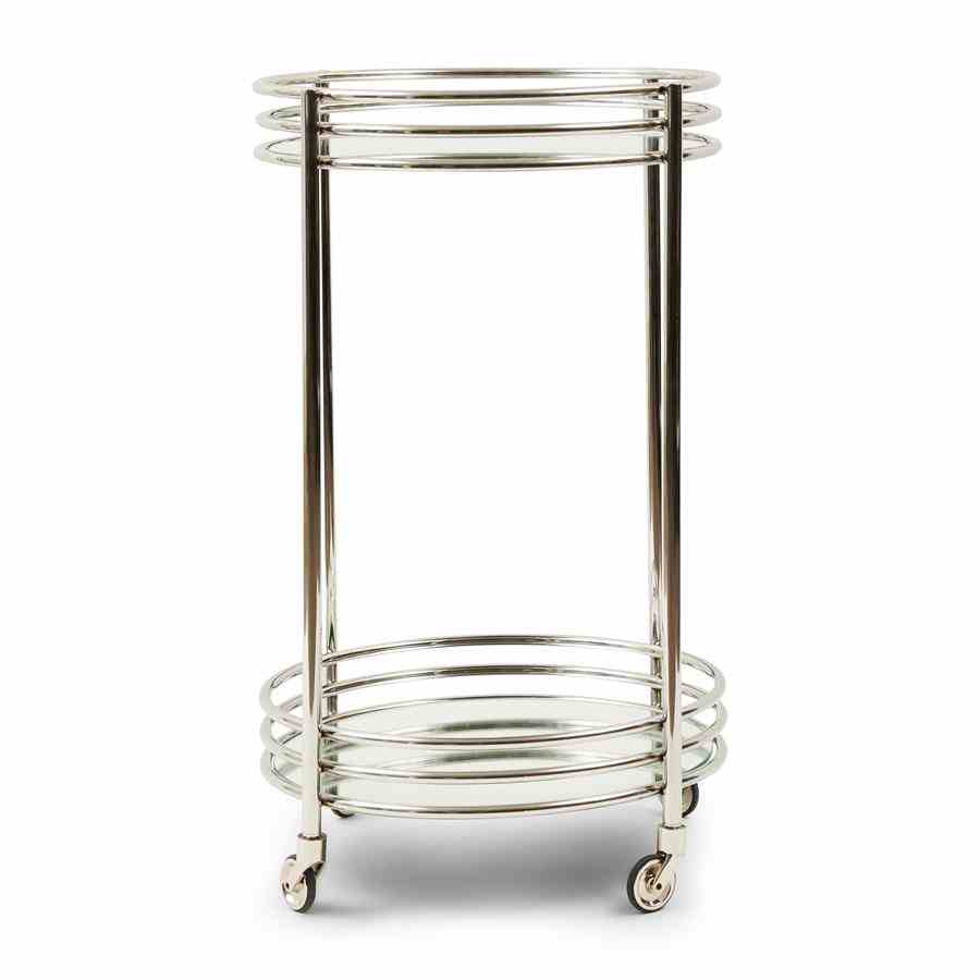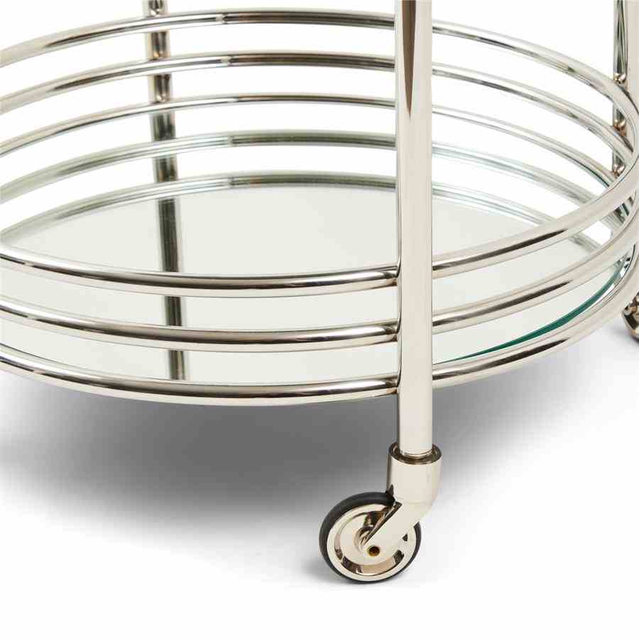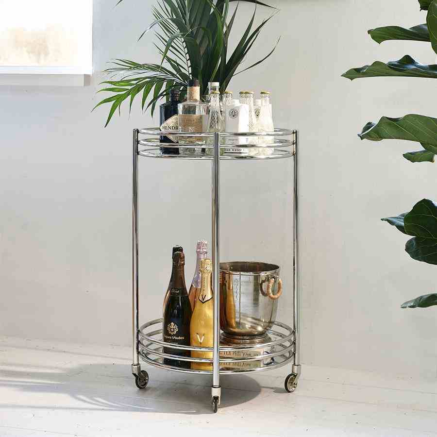 En bevegelig bar, det er luksuriøst. Etter eget skjønn, la den stå der den står, eller rull den dit du vil ha den. Laget av vakkert skinnende metall, vil denne assistenten gjerne møte deg. Tar med alt du trenger, hvis du laster det på forhånd. Med sine to bordplater gir den god plass.