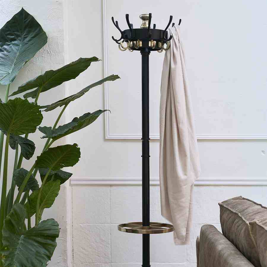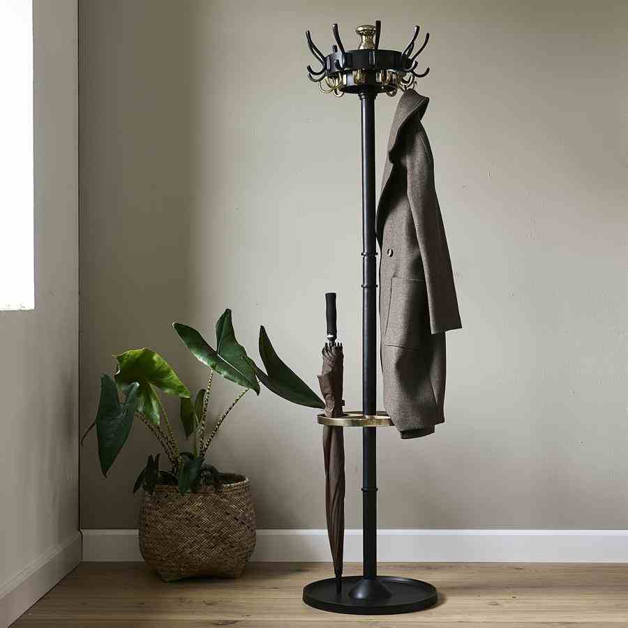 Denne klesstativet ser litt ut som en klesstativ på en fin brun kafé. Hyggen stråler av det. Håndlaget av sort pulverlakkert aluminium, bortsett fra enkelte deler. Mange kåper kan henges på denne. Og paraplyer avsatt i den. Og den tar ikke engang så mye plass.