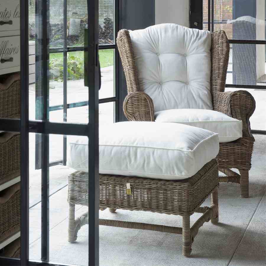 Nicholas Wing Chair Fotskammel er en kjent klassiker. Rustikk rotting utvikler sin grå farge naturlig. Denne fotskammelen passer sammen med Nicolas Wing Chair (inkludert puter).