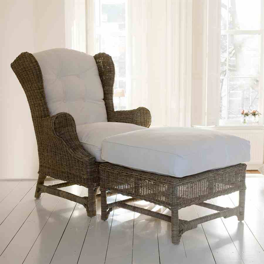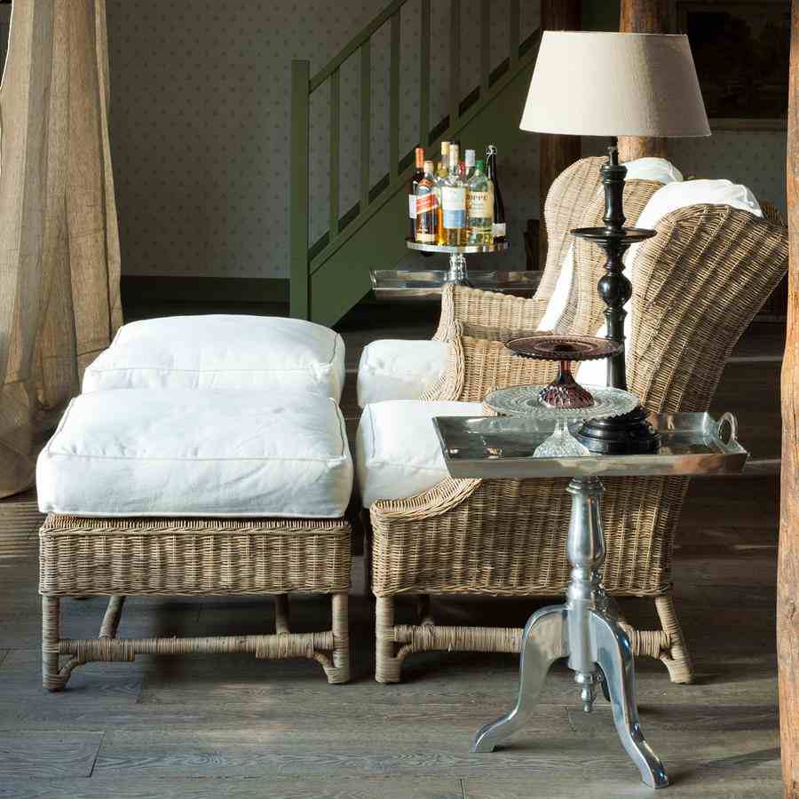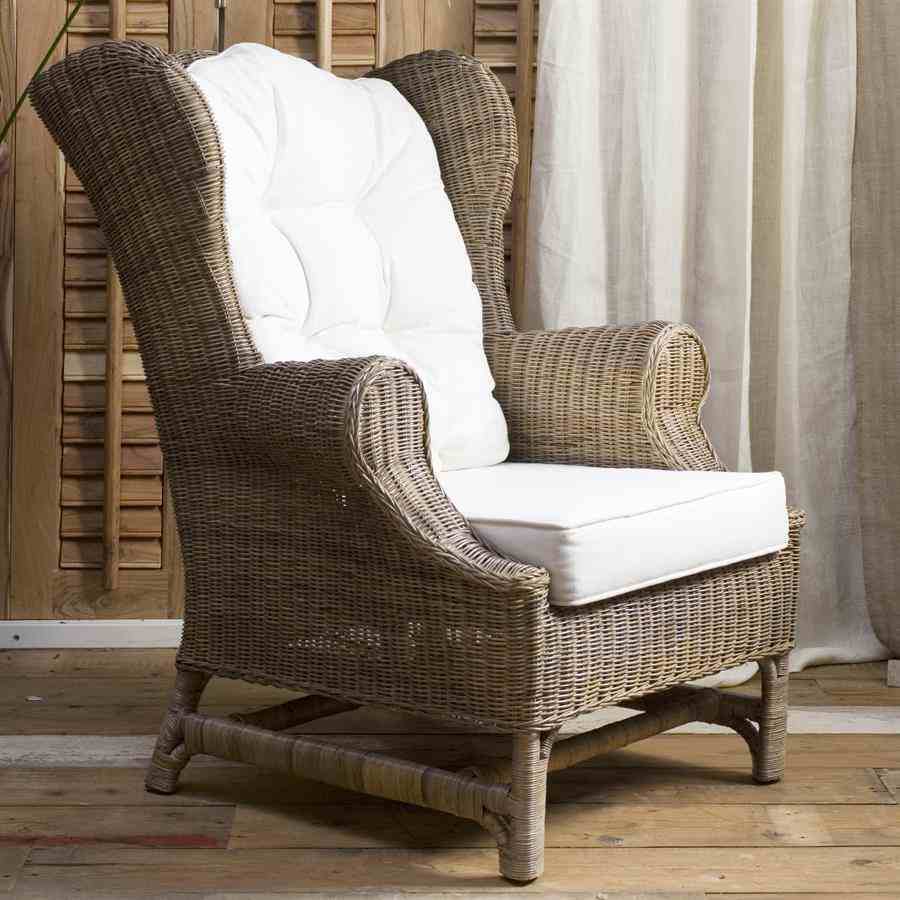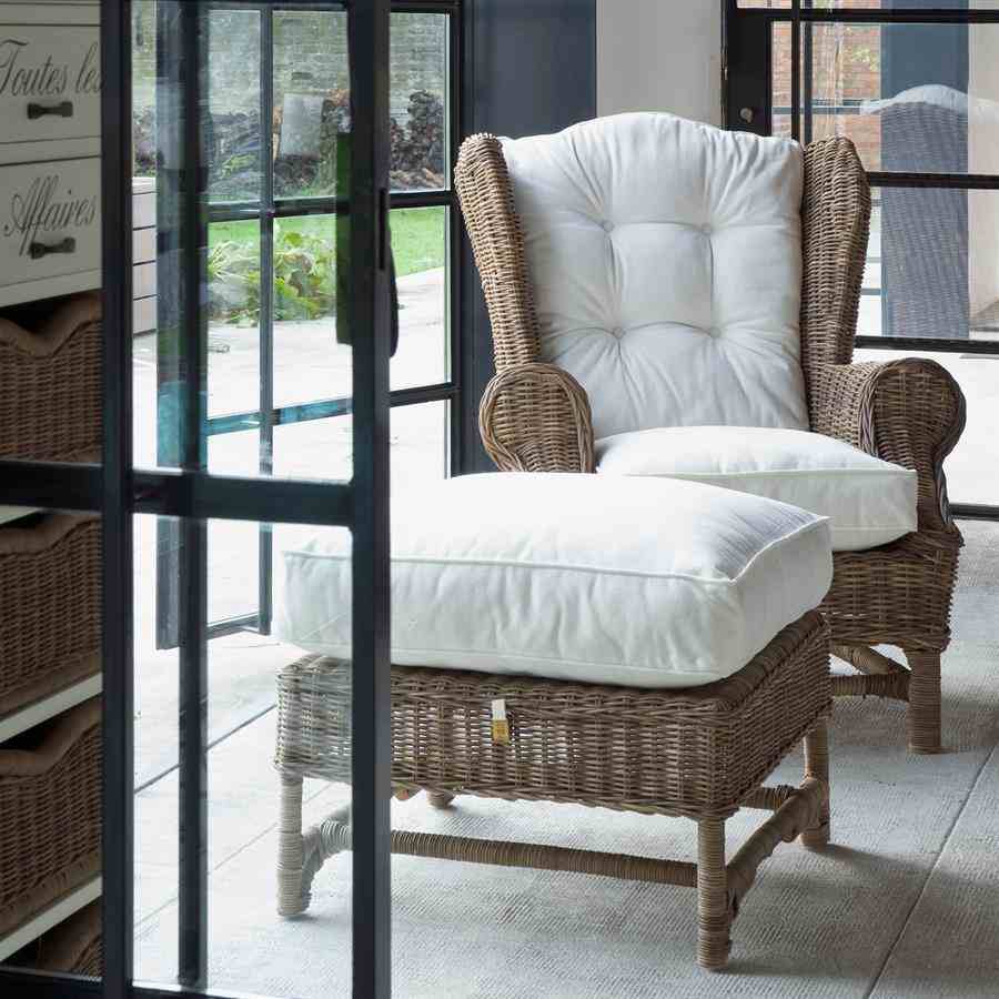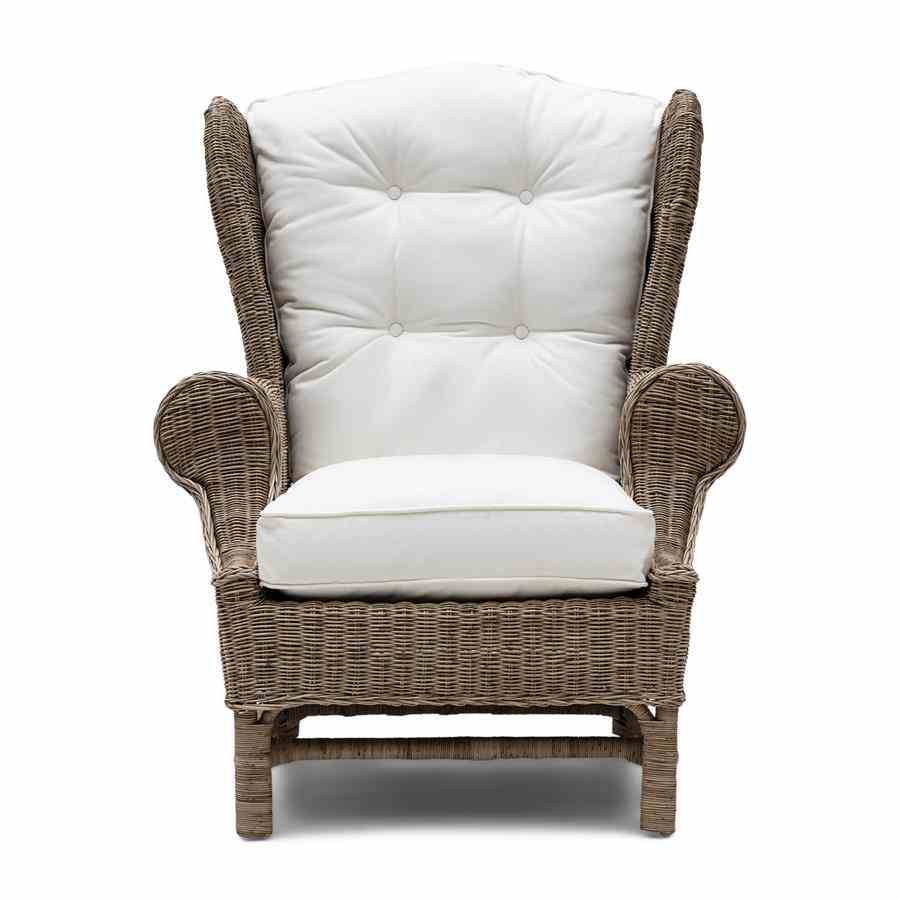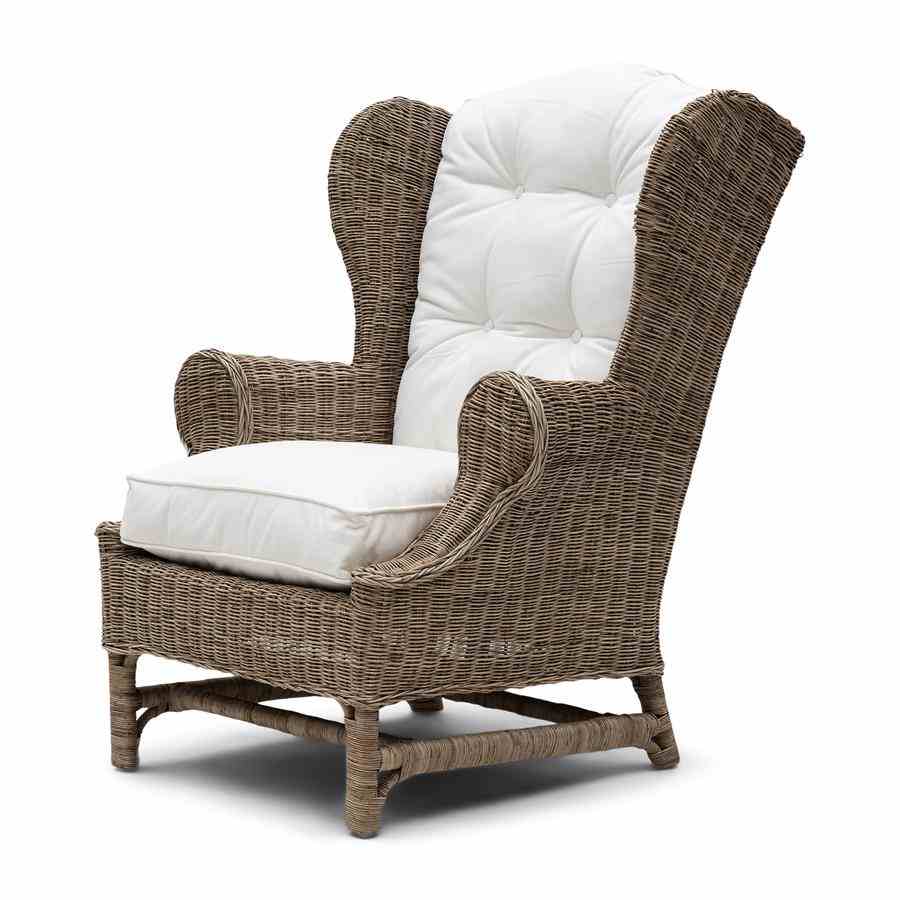 Nicolas Wing Chair er en kjent klassiker. Rustikk rotting utvikler sin grå farge naturlig. Inkluderer sete- og ryggputer og det er også en fotskammel i denne serien.