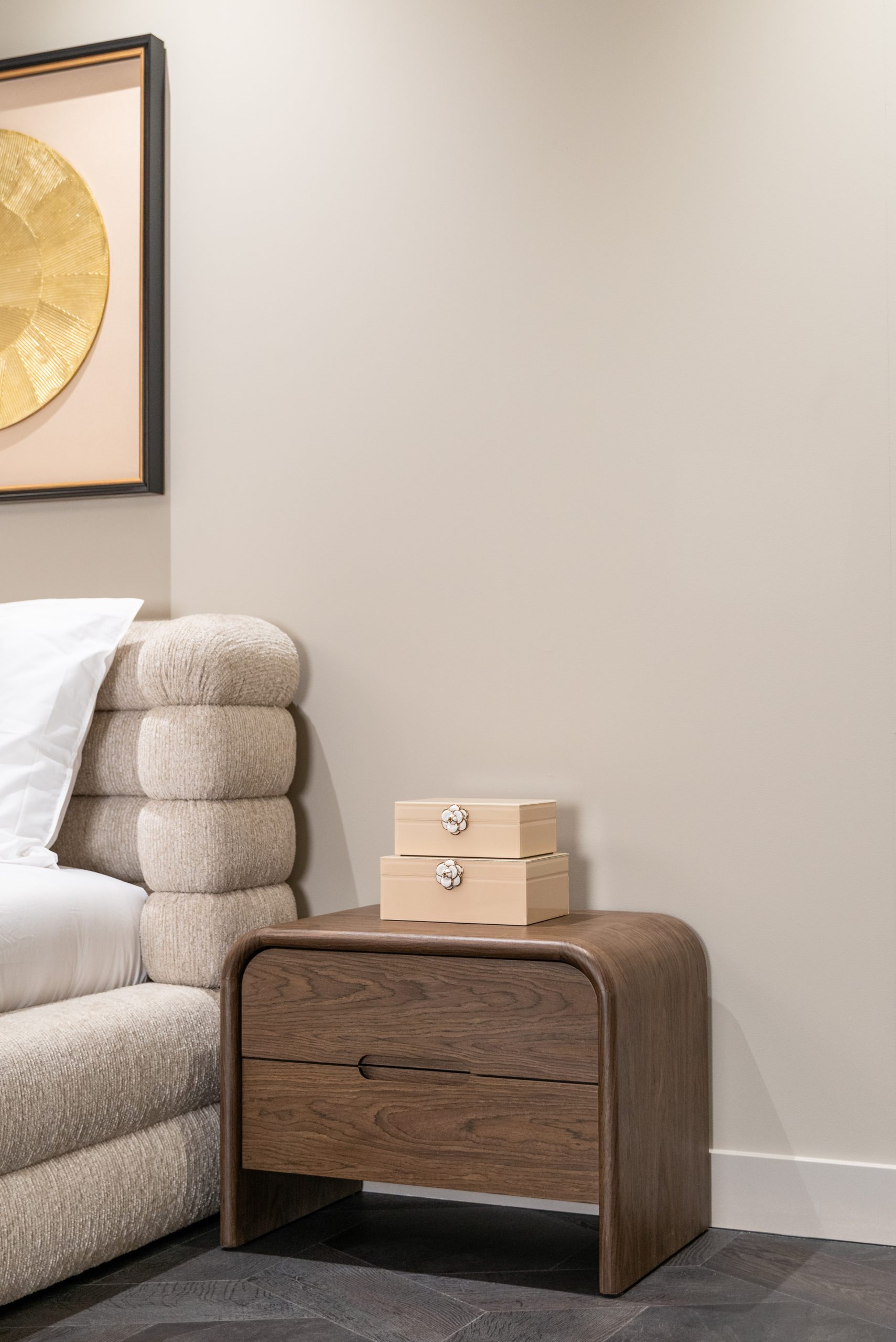 This end table features a compact, closed silhouette with straight lines. The design includes two integrated drawers, creating a calm and structured appearance. The warm brown tone fits various interiors.