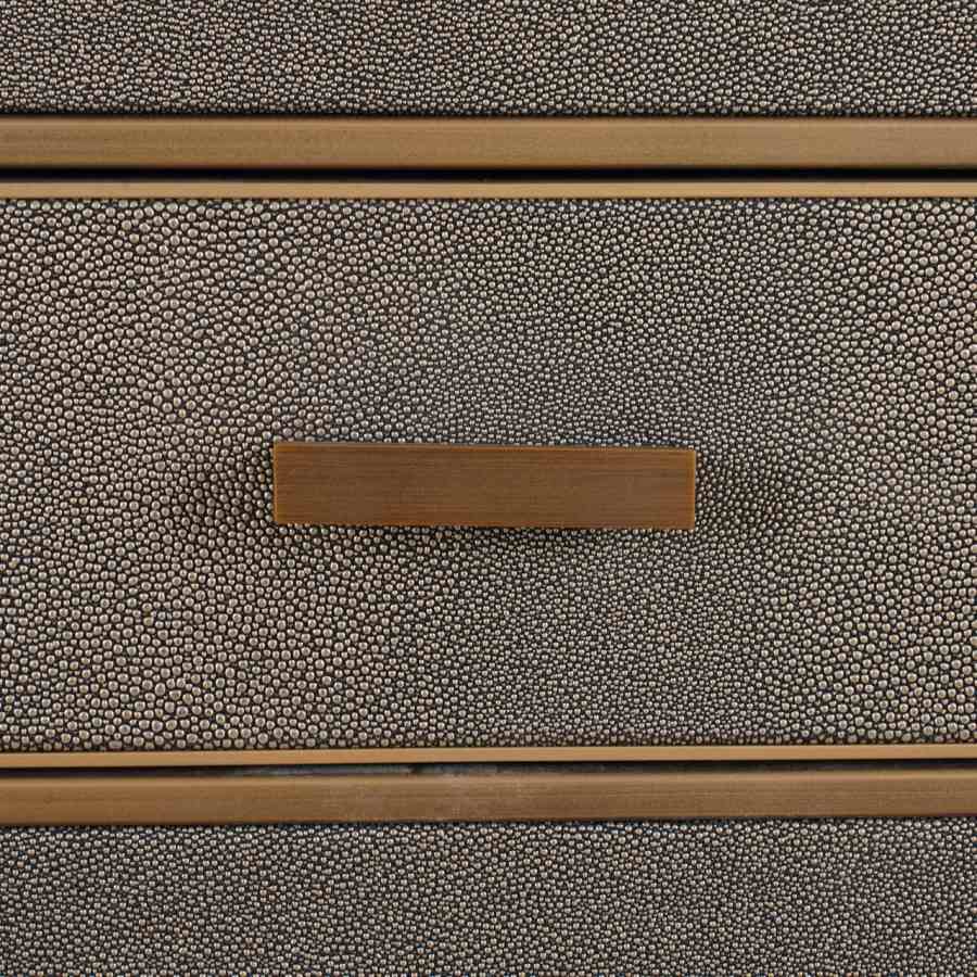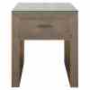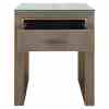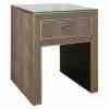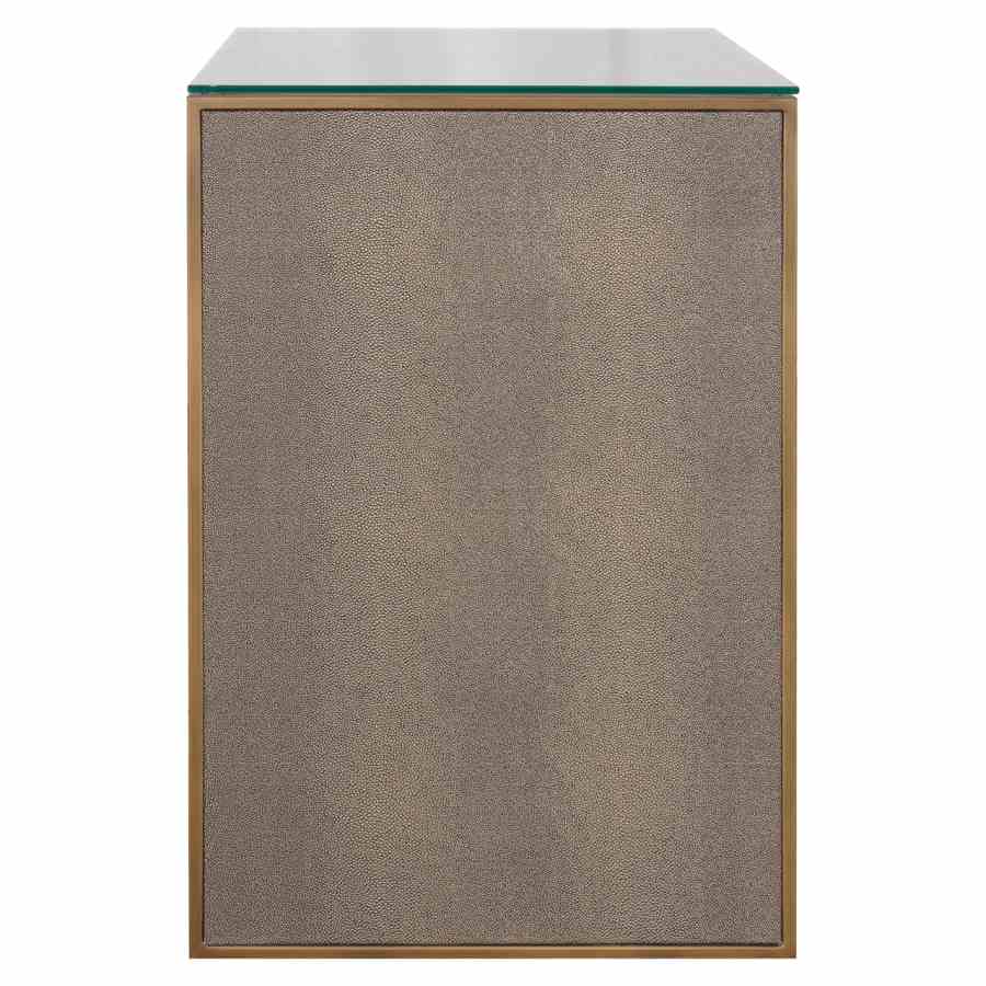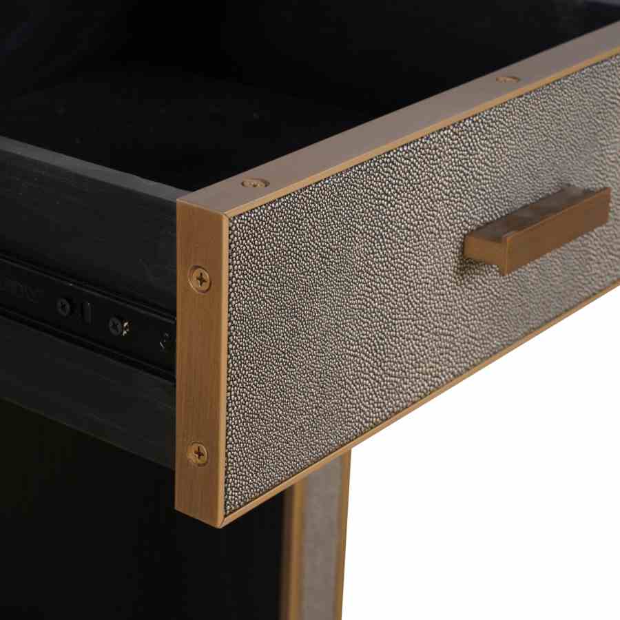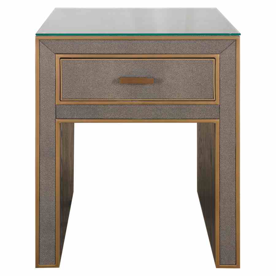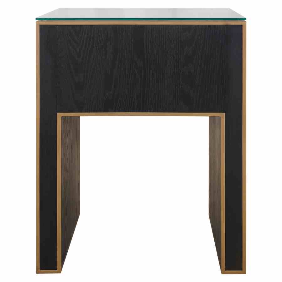 The Bloomville nightstand with one drawer exudes class with its premium PU leather finish, glass top, and refined gold details. This elegant piece is perfect for a hotel chic bedroom, combining practical storage with a luxurious look. The blend of rich materials and soft textures makes it a stylish addition beside any bed.