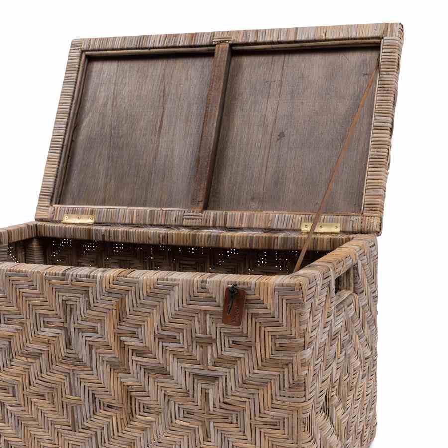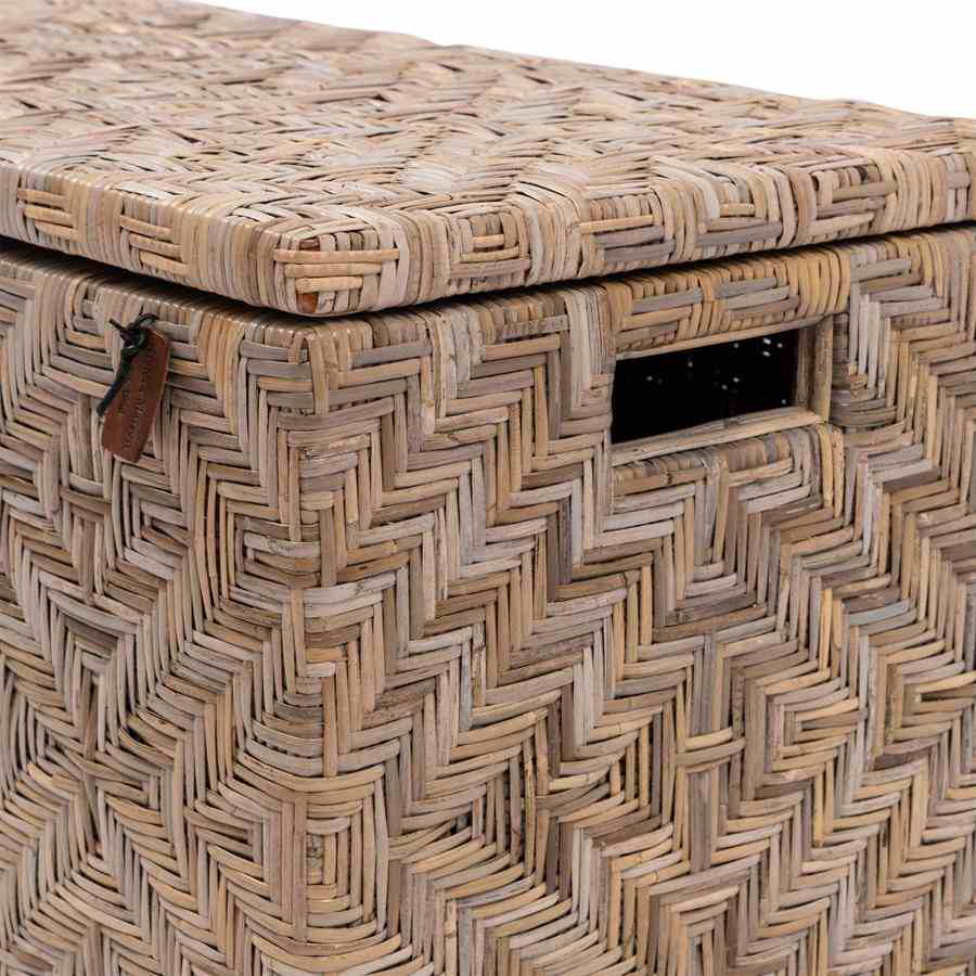 Port Barton Trunk inneholder rotting lasio, en rottingvariant med en nydelig glans. Rottingen er håndflettet og hver stokk har sin egen unike farge. Dette skaper en symfoni av fargenyanser rundt hele stammen. Denne bagasjerommet er tilgjengelig som et sett eller separat, i to forskjellige størrelser.