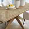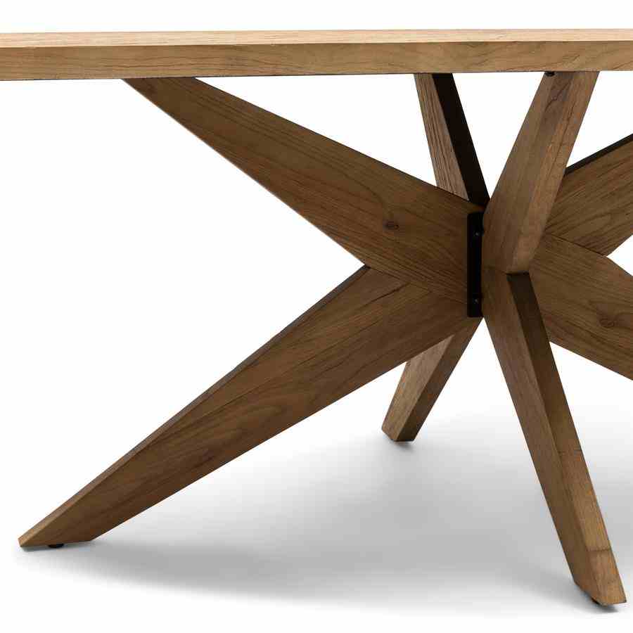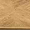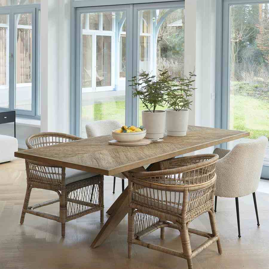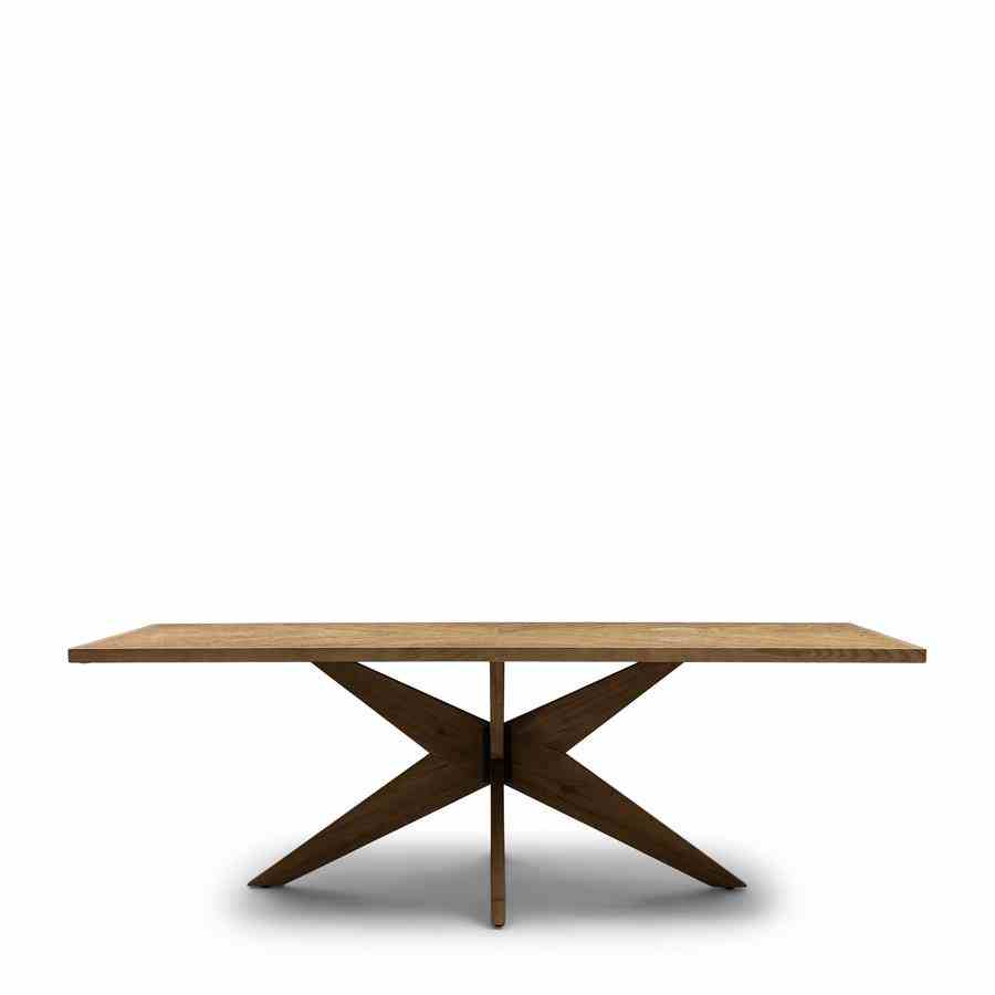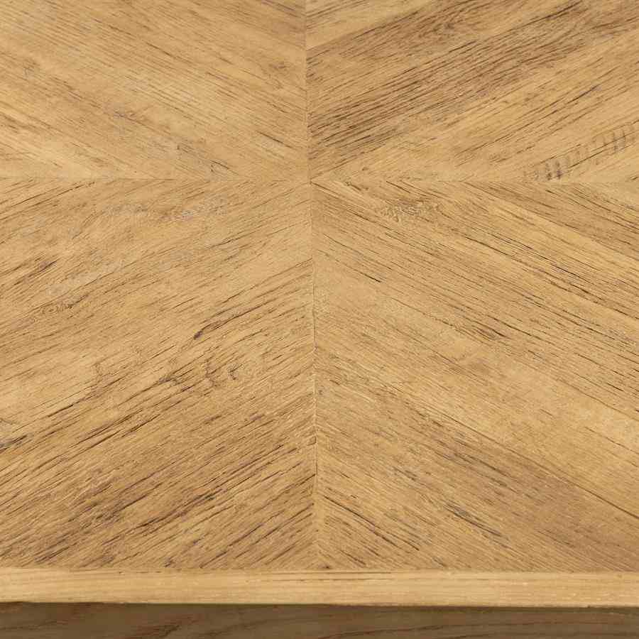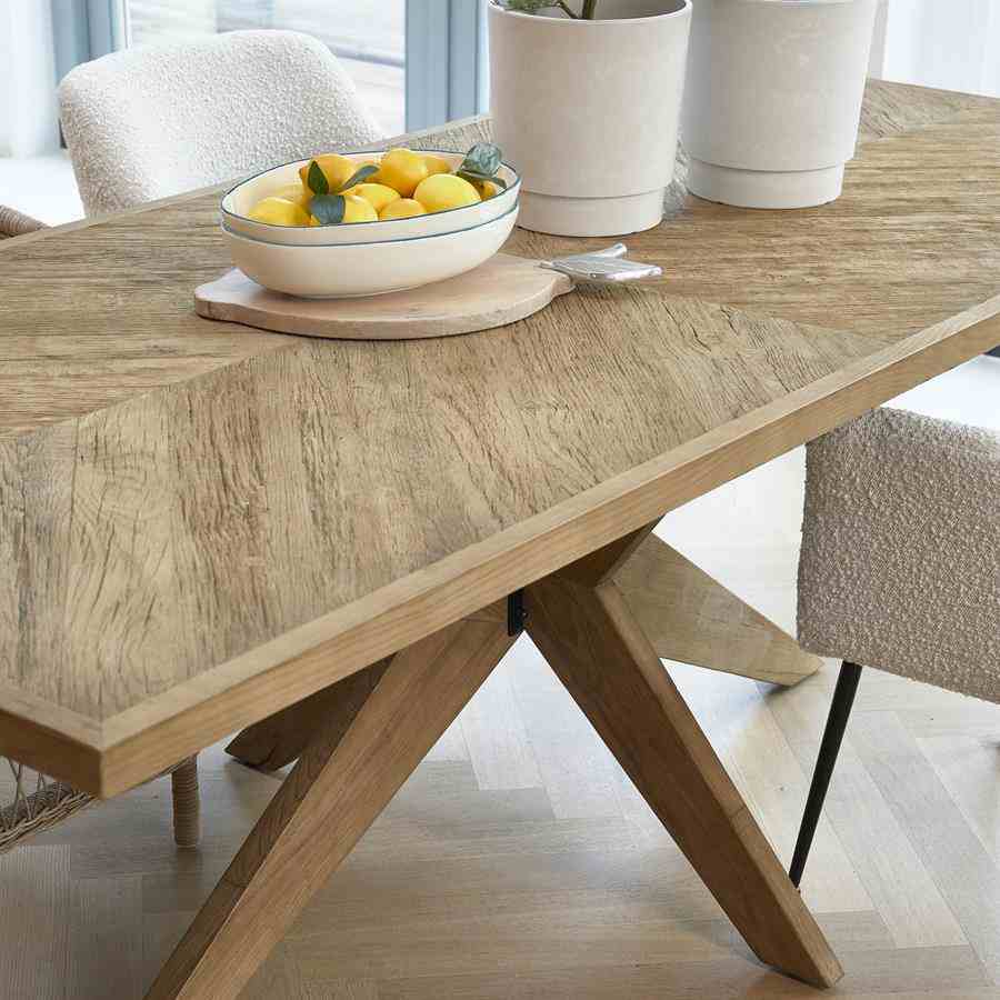 De vakre mønstrene vi kjenner fra tregulv, som et fiskebeinsmønster, sees nå også i bordplater, som i dette Portland spisebordet. Dette bordet er laget av solid gjenvunnet eik innlagt i en ungarsk spiss. Eikebenet er krysset, noe som gir det et solid utseende.