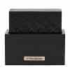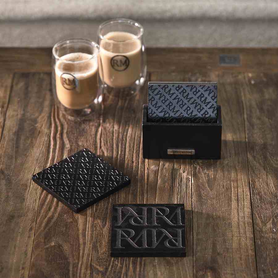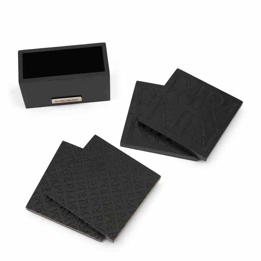 Coasters for din kopp te, kaffe eller en kald drink, med RM Identity-settet med fire coasters får du et praktisk interiørtilbehør. Underlagene er firkantede og laget av svartmalt tre, tilsvarende holder har samme farge. RM-monogrammet er innarbeidet som et vakkert mønster i treet.