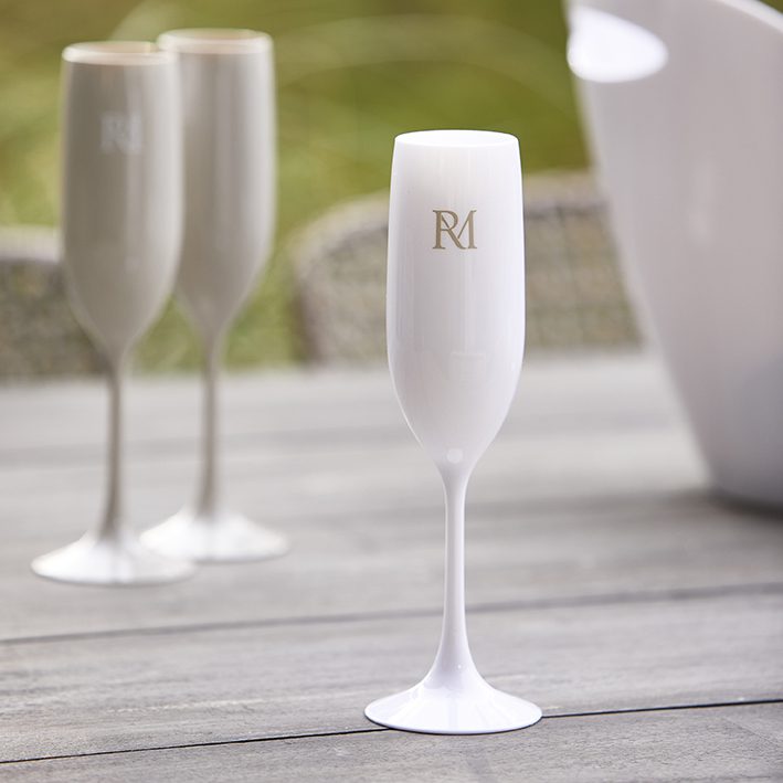 The white flute is decorated with an RM monogram in flax. Take the acrylic ‘glassware’ with you on the boat, on holiday or to the beach.