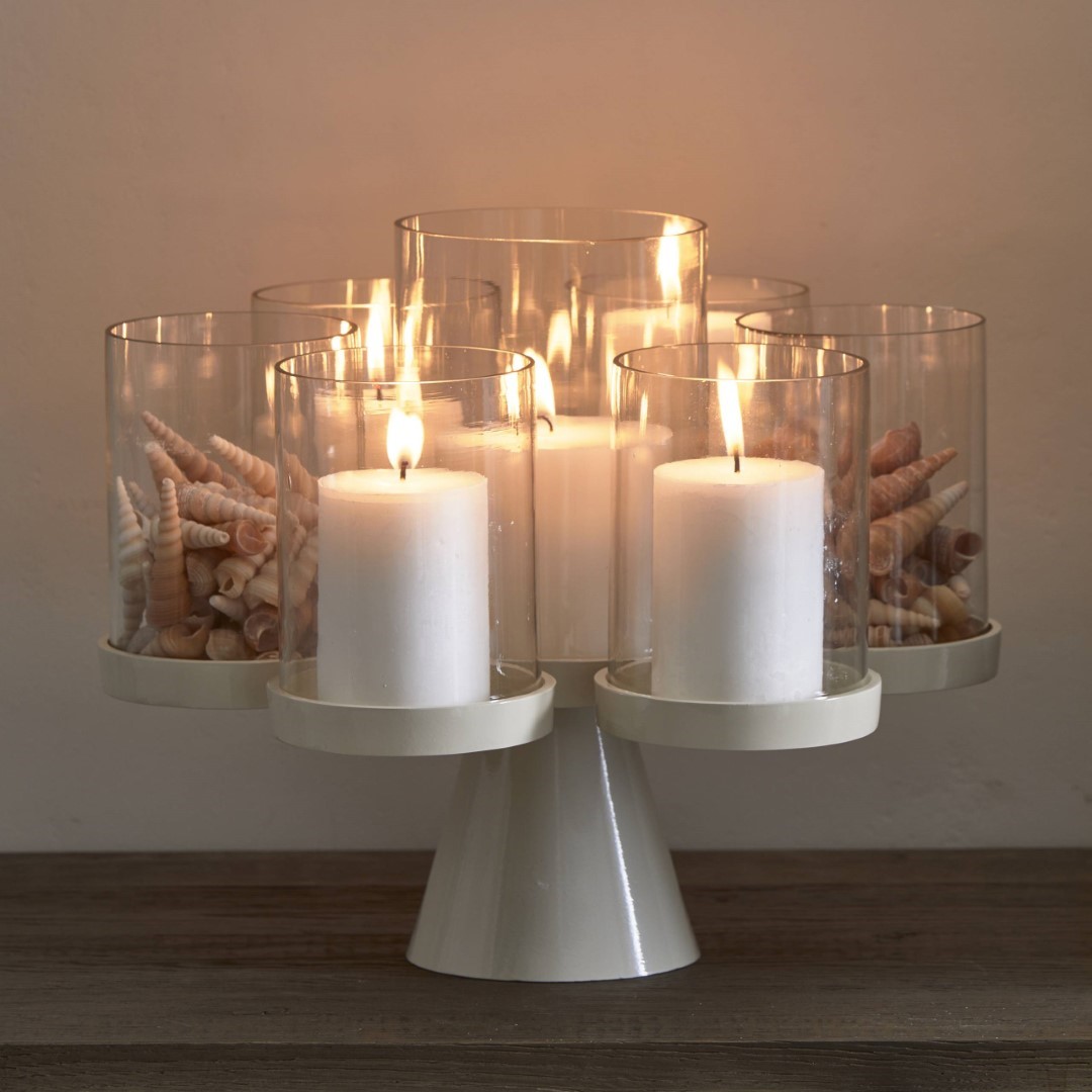 Ikke mindre enn syv vindlysholdere i glass er samlet i RM Porto Hurricane, der den midterste stikker ut over resten. De kan holde stumpe stearinlys eller store telys. Eller litt egen dekorasjon her og der. Basen og brettet er laget av belagt aluminium.