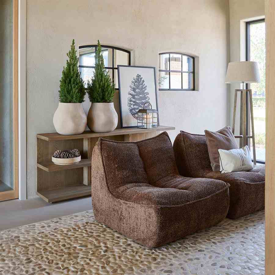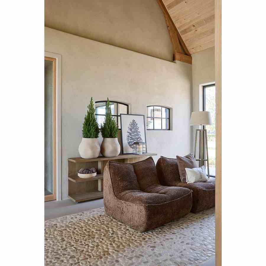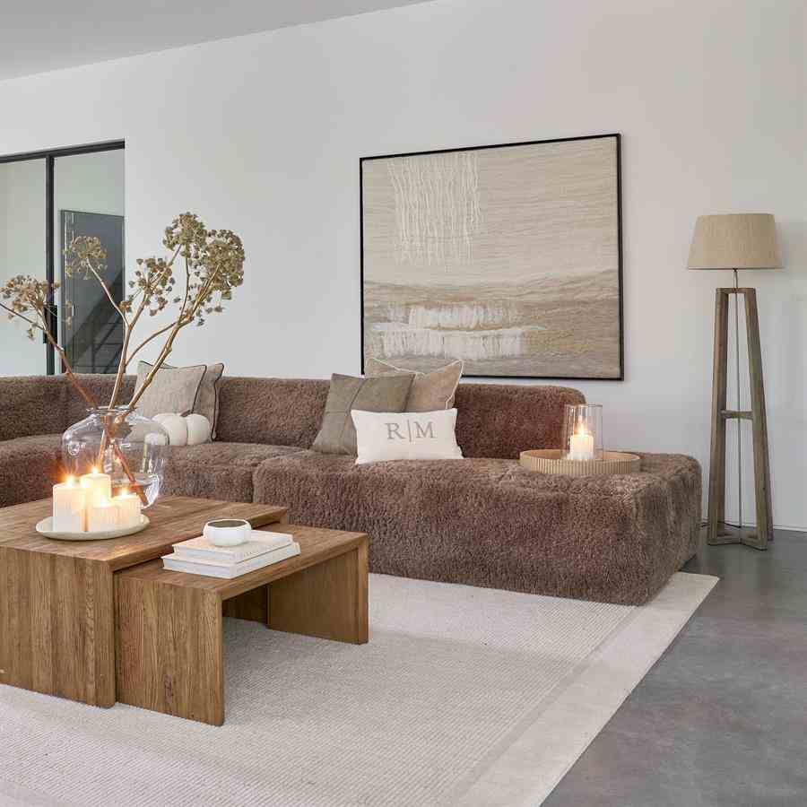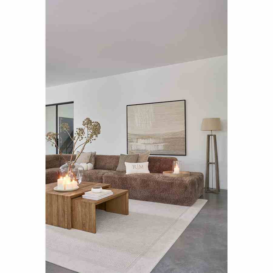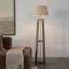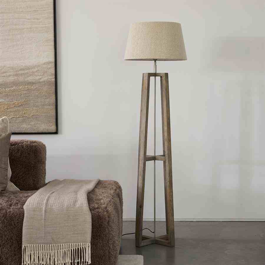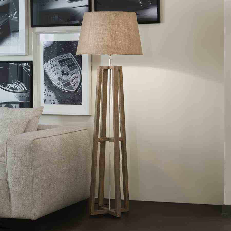 En høy gulvlampe med fire treben som har et rustikk, men elegant utseende. Denne lampen utstråler varme, spesielt med en pen lampeskjerm, og legger en sjarmerende aksent til ethvert interiør. Lampen er utstyrt med en praktisk trykknapp for enkel betjening.