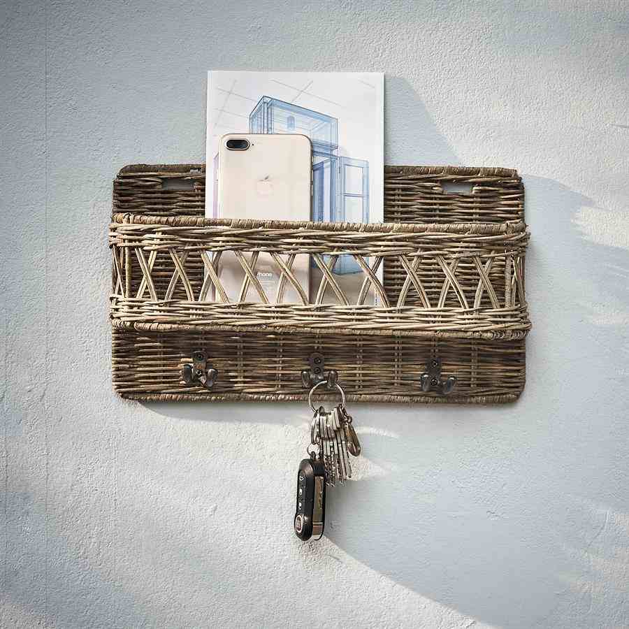 Ikke lenger leting i huset etter nøklene. Bare på sin faste plass i den rustikke nøkkelkurven i rotting. Eller på nøkkelhyllen er begge navnene riktige. I tillegg til kroker har denne nøkkelholderen også en kurv bak der nøkler, dørpassasjer eller lignende kan plasseres. Med en bredde på 35 cm vil nøkkelholderen alltid finne en plass i nærheten av døren.