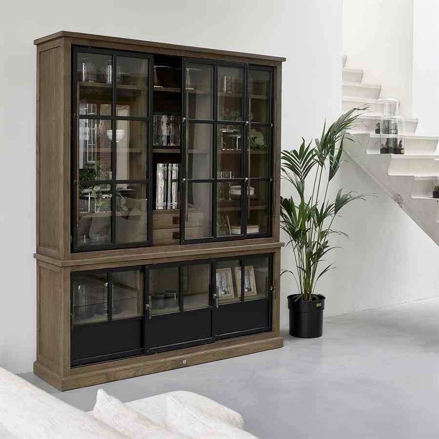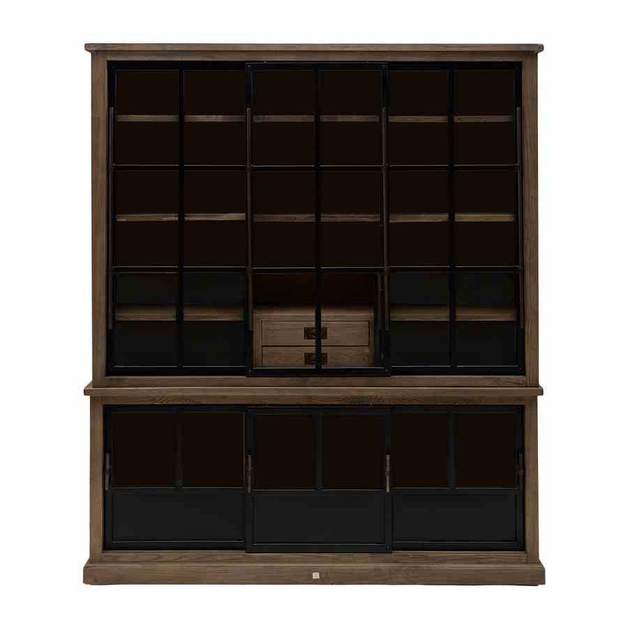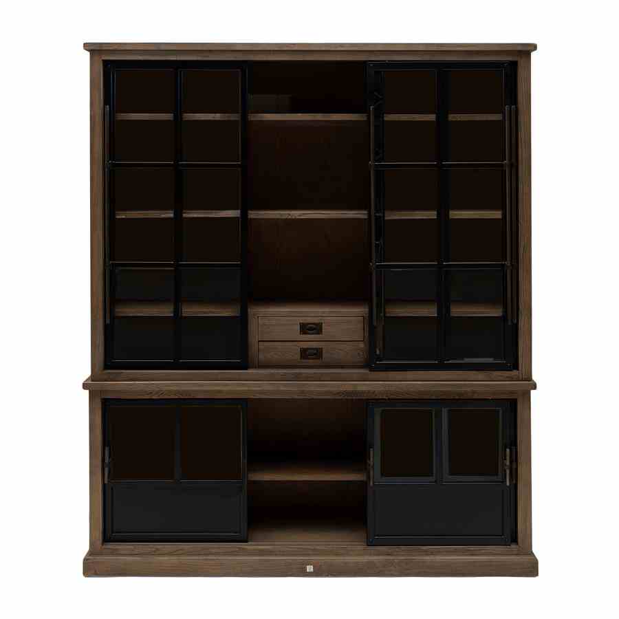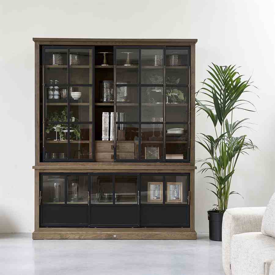 The Hoxton Cabinet XL er et stort vitrineskap med et industrielt utseende. Den er laget av resirkulert asketre, med innglassede sorte jerndører. Siden skyvedørene kan plasseres bak hverandre, kan du la midtdelen av skapet stå åpen for dekorativ effekt.