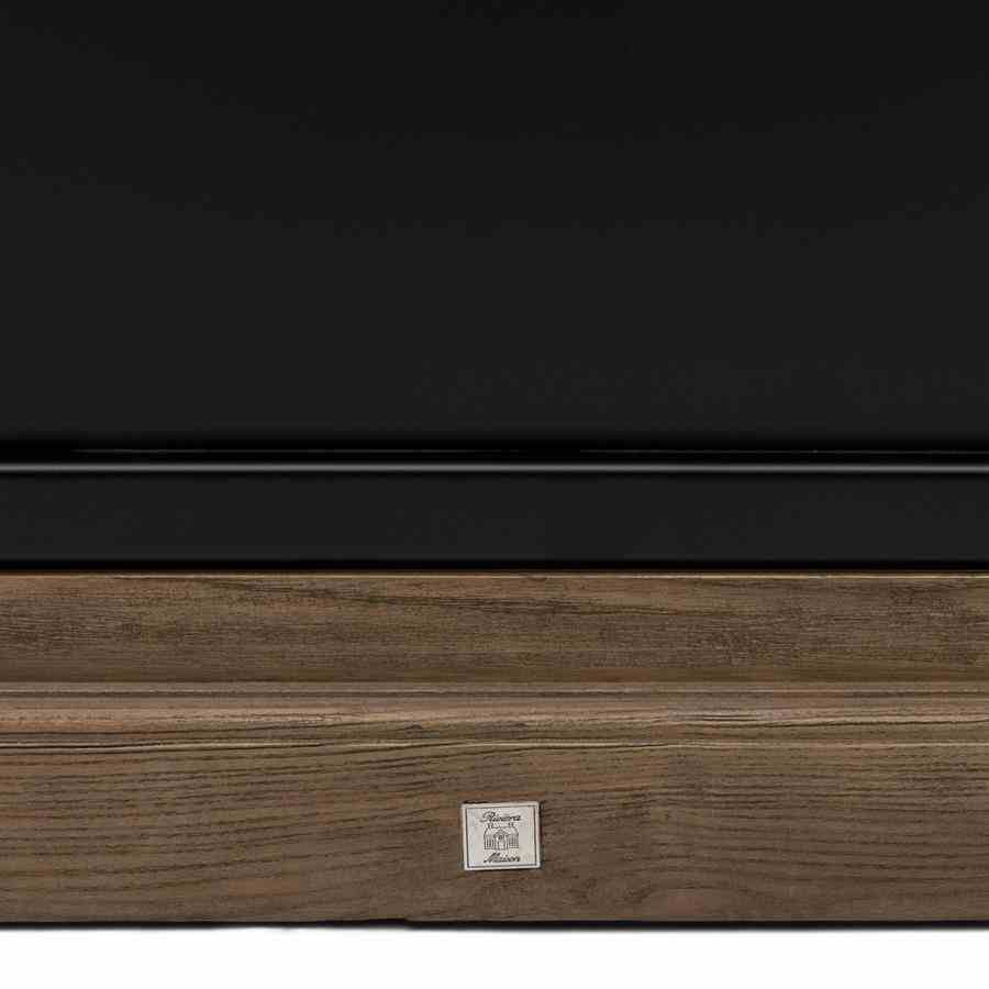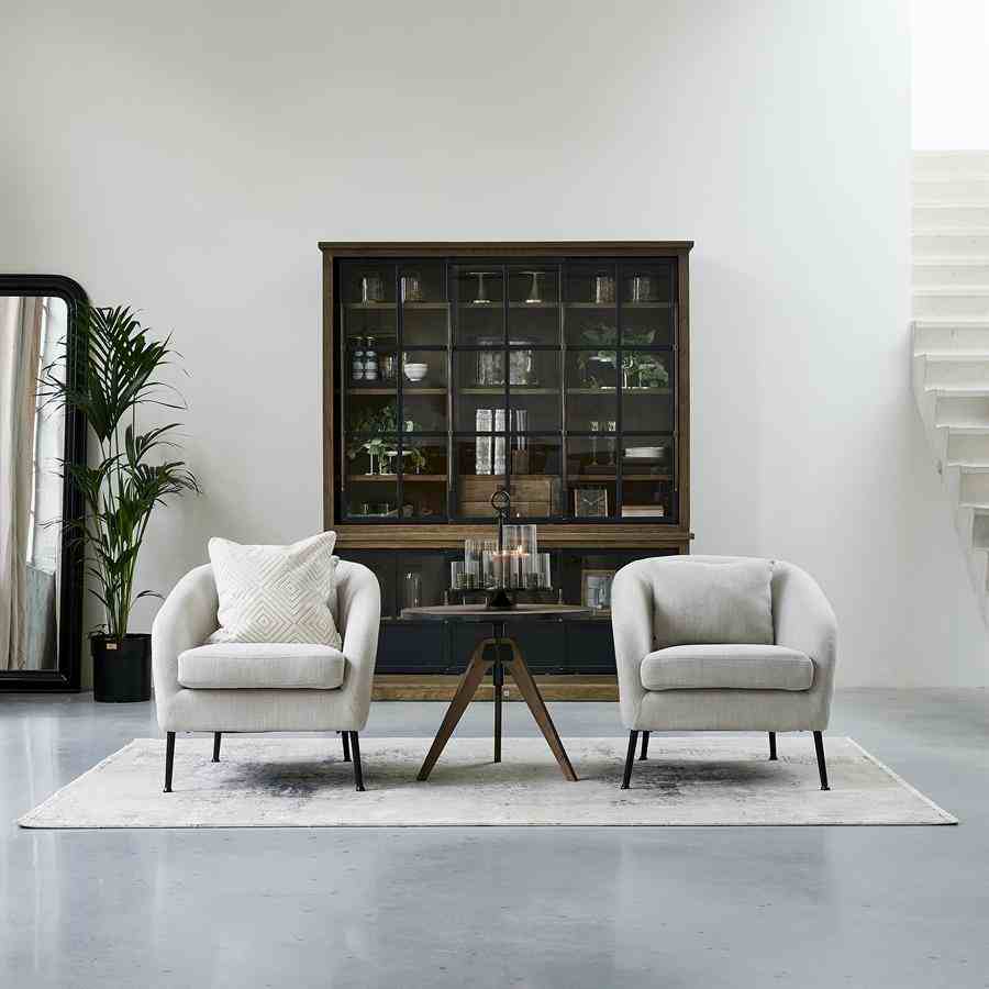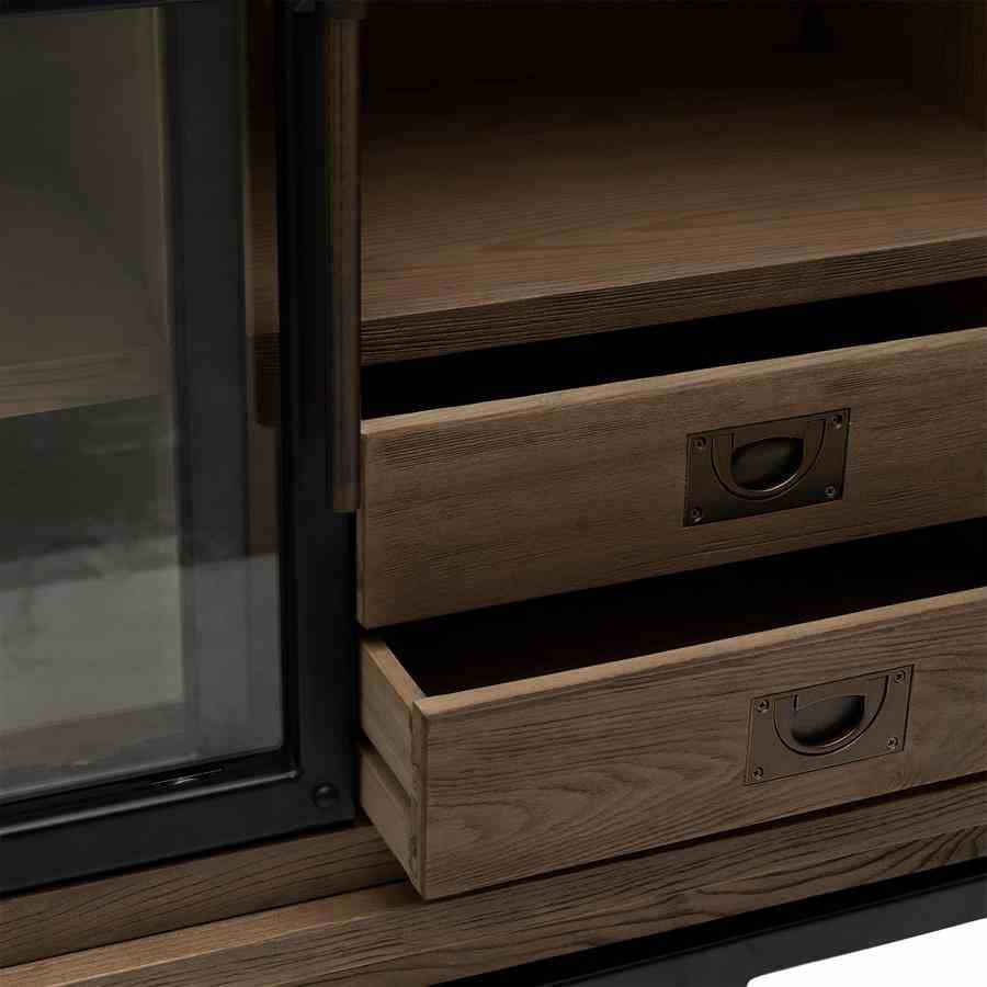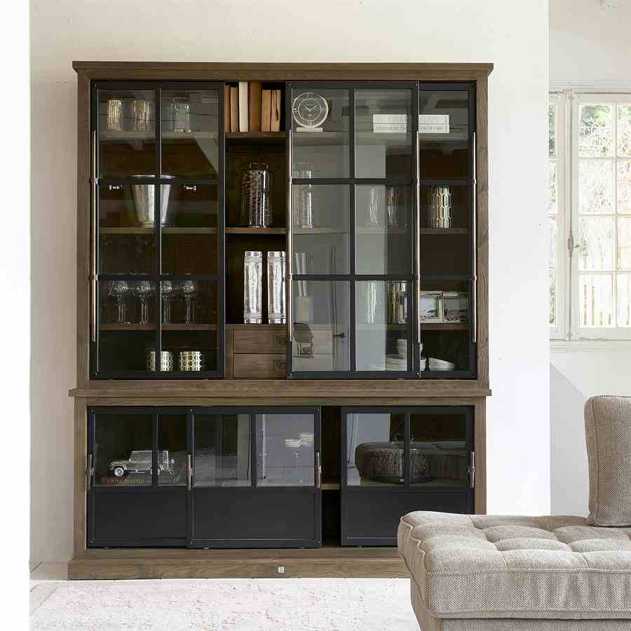 The Hoxton Cabinet XL er et stort vitrineskap med et industrielt utseende. Den er laget av resirkulert asketre, med innglassede sorte jerndører. Siden skyvedørene kan plasseres bak hverandre, kan du la midtdelen av skapet stå åpen for dekorativ effekt.
