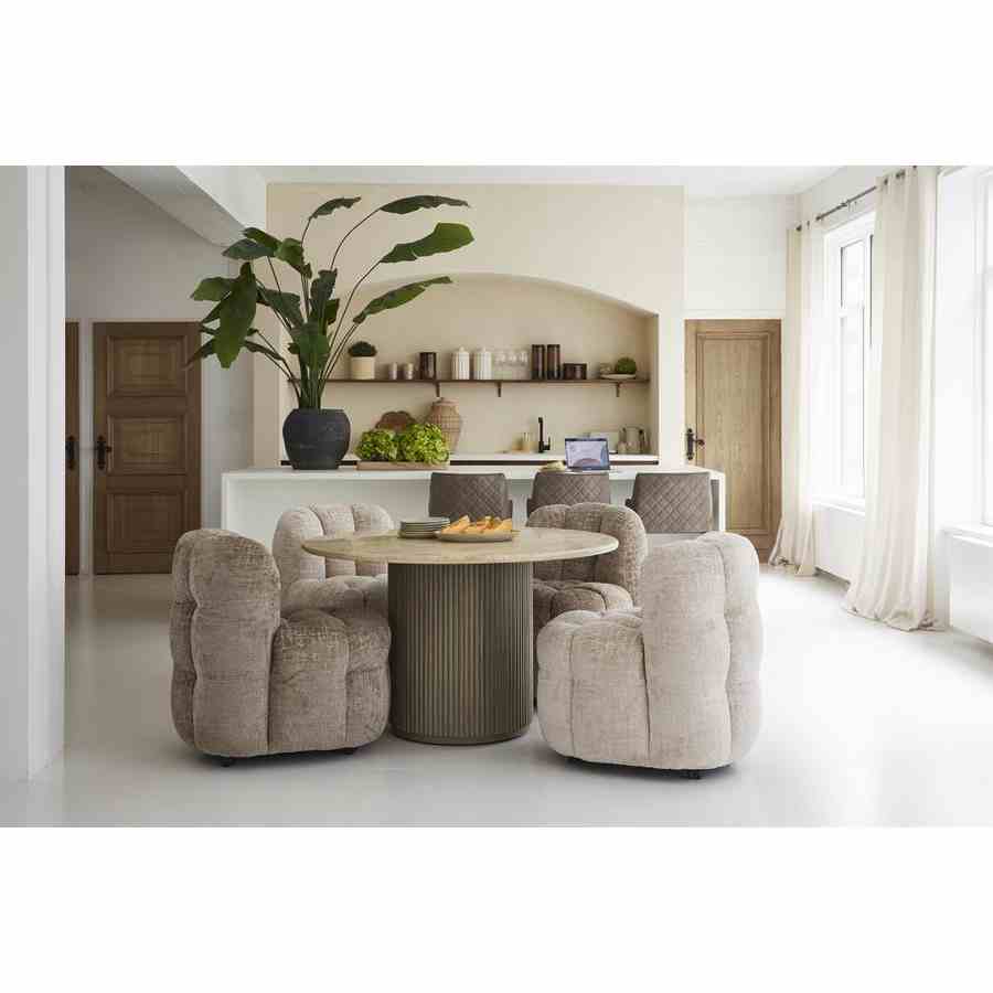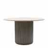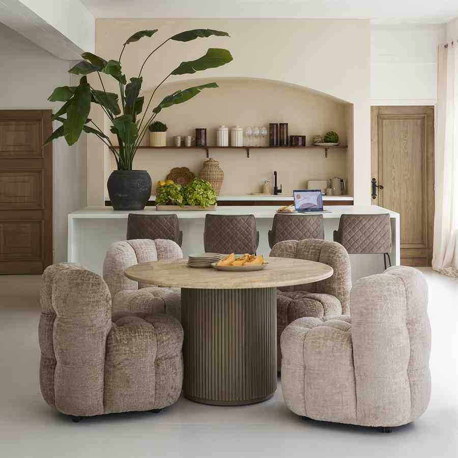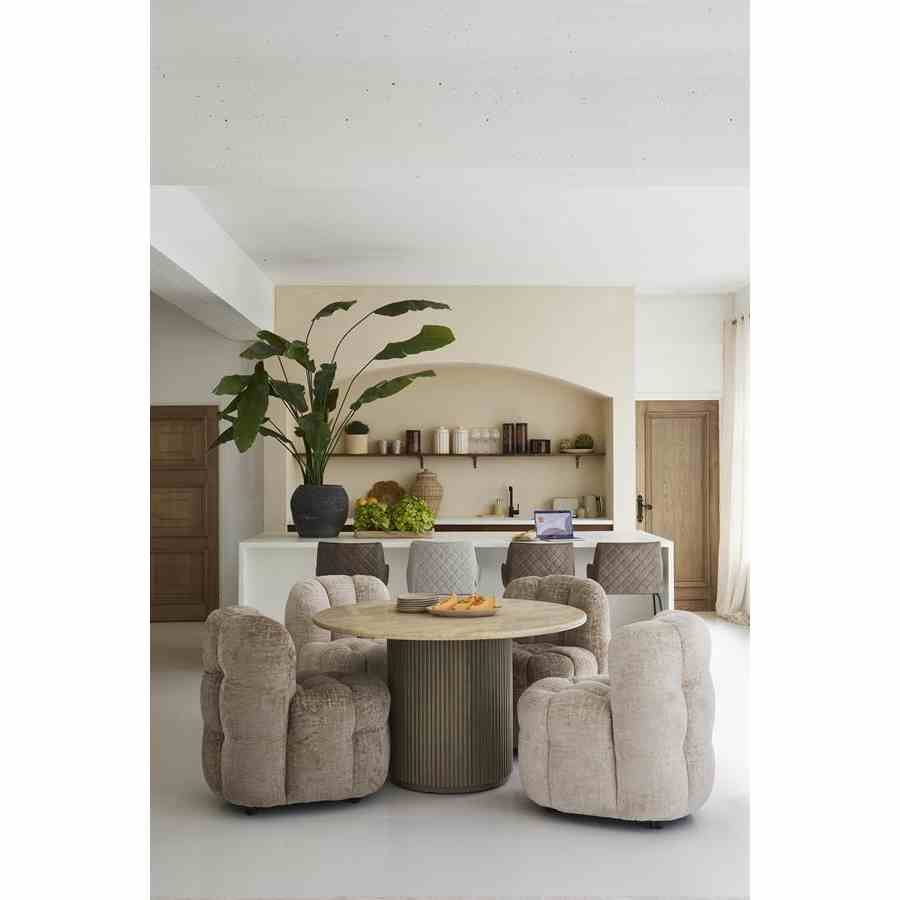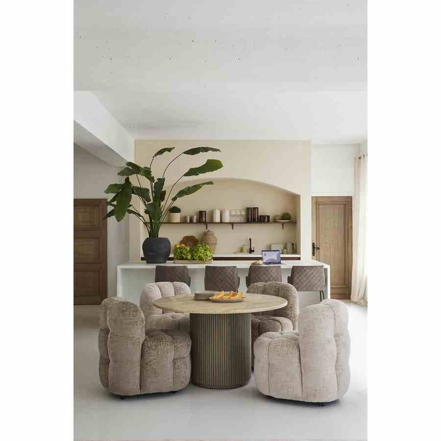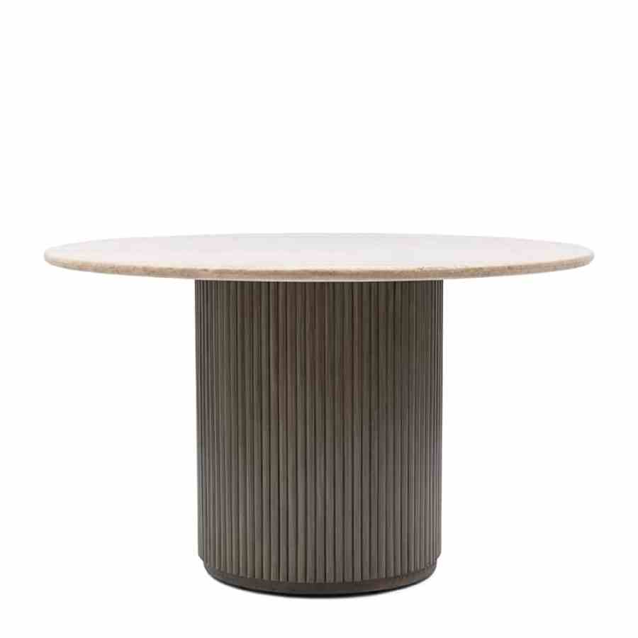 Dette runde spisebordet i naturlige toner har en raffinert travertinplate, som gir hvert bord en unik karakter. Den brede basen, med striper av mangotre, gir et elegant og varmt utseende. Dette bordet skaper en innbydende atmosfære og er midtpunktet i spisestuen eller spisestuen. Perfekt for å ta imot gjester eller nyte koselige familiemåltider.