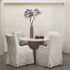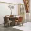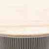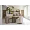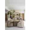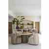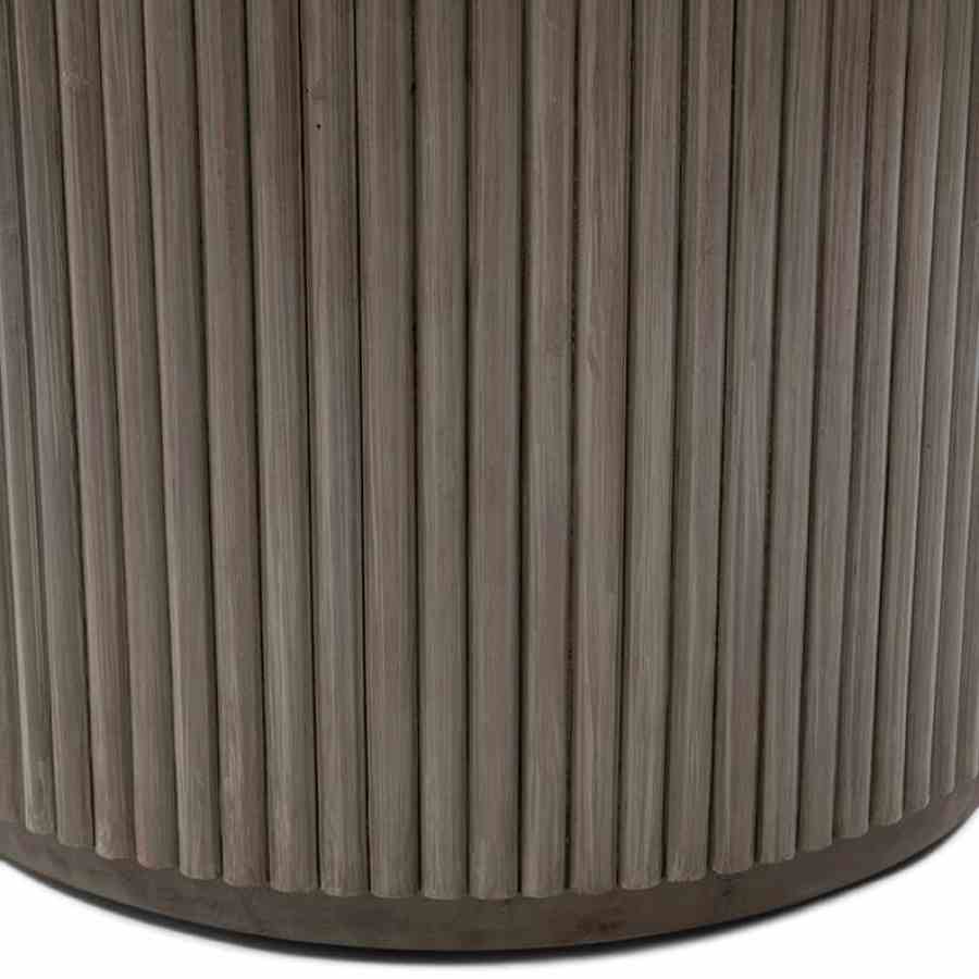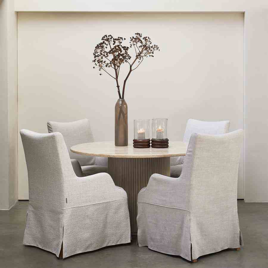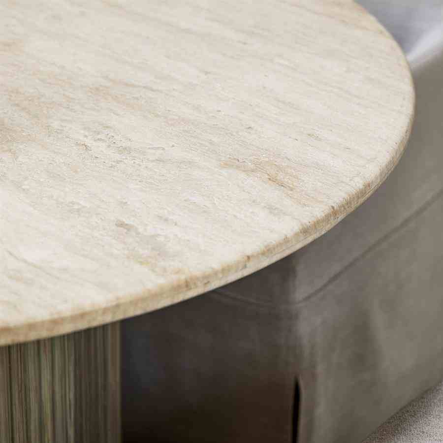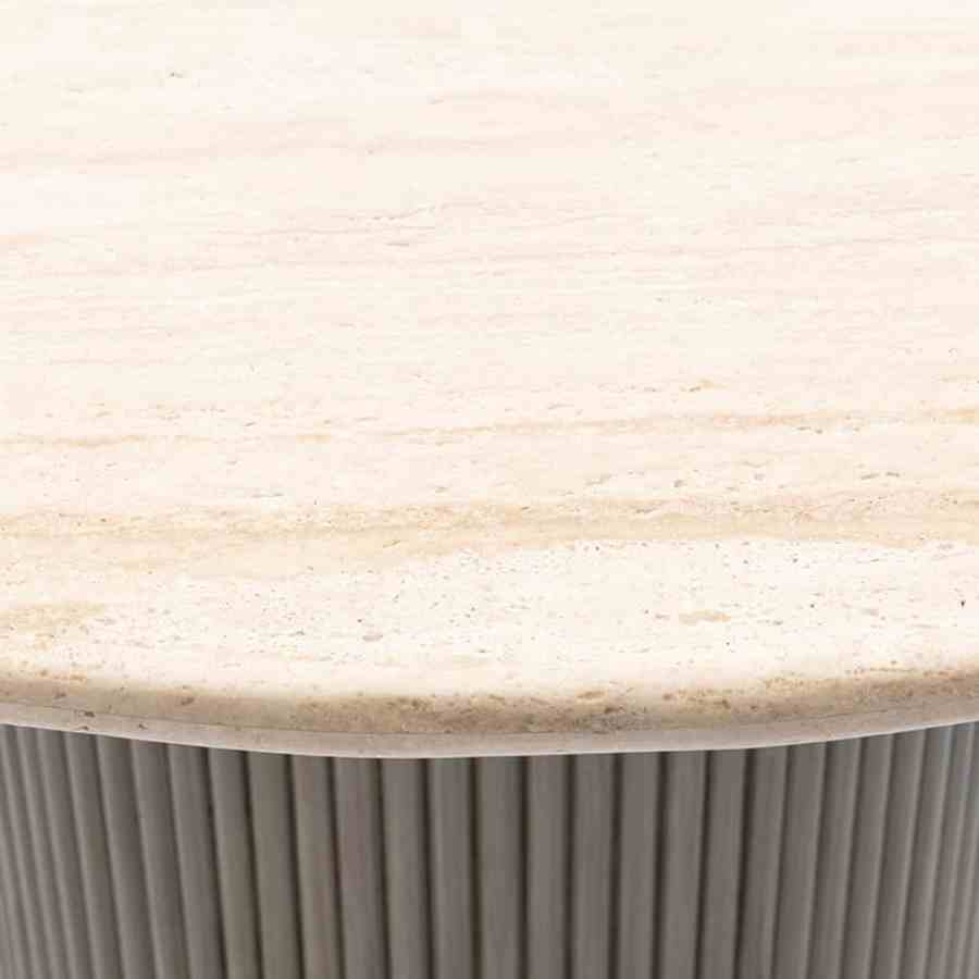 Dette runde spisebordet i naturlige toner har en raffinert travertinplate, som gir hvert bord en unik karakter. Den brede basen, med striper av mangotre, gir et elegant og varmt utseende. Dette bordet skaper en innbydende atmosfære og er midtpunktet i spisestuen eller spisestuen. Perfekt for å ta imot gjester eller nyte koselige familiemåltider.